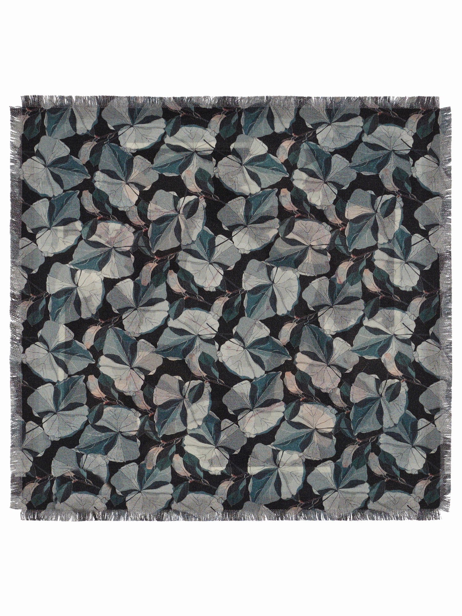 100% wool – warm, breathable, and soft to the touch Reversible design with two complementary motifs Floral side with bold contrast; leafy reverse for subtle sophistication Fringed edges add artisanal texture Generous cut ideal for wearing as a wrap, shawl, or oversized scarf