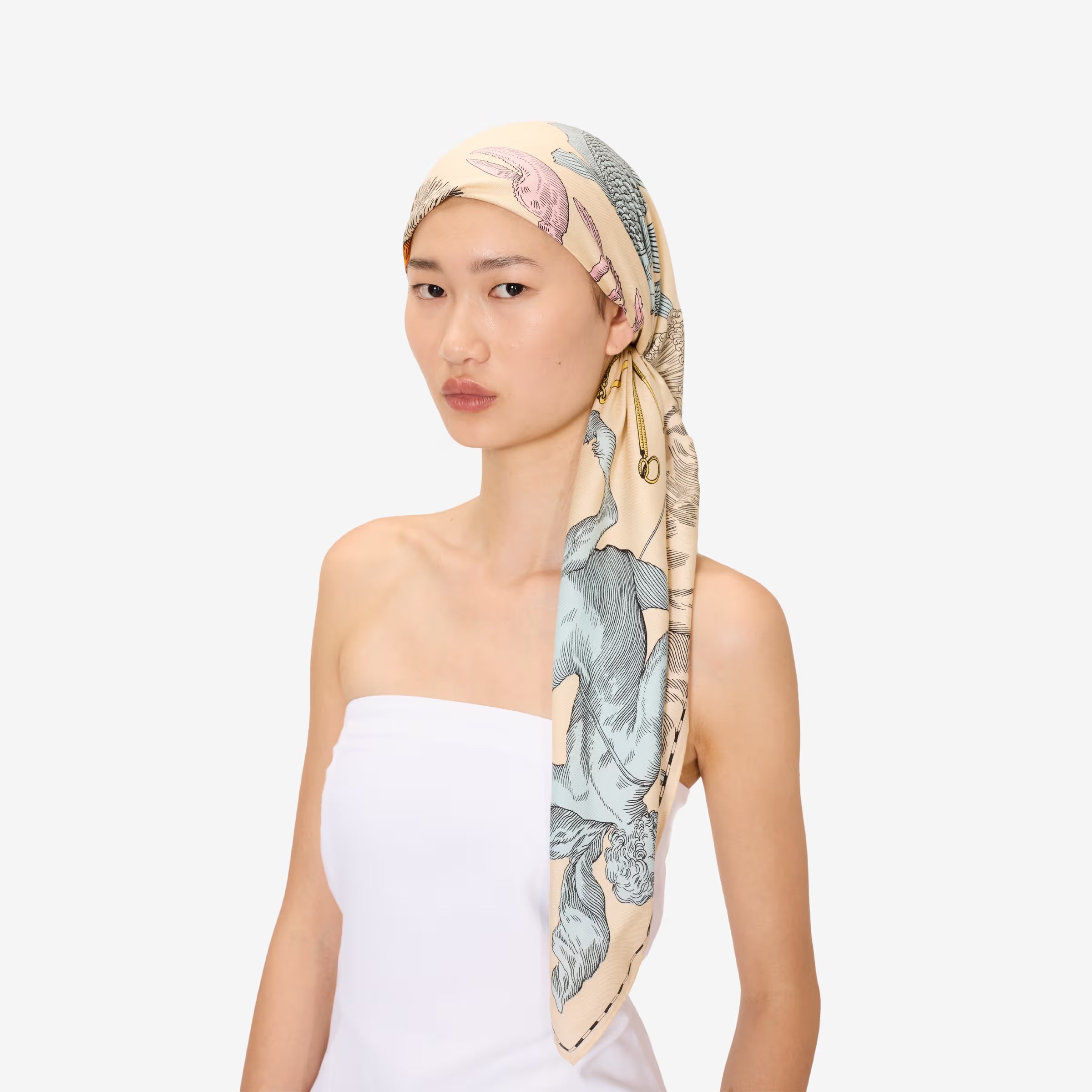 Styling Ideas: Classic Parisian-chic: Fold into a triangle and tie around your neck with a trench coat or crisp white shirt. Boho celestial: Wear as a headscarf with flowy dresses or linen separates. Luxe layer: Drape over your shoulders in the evening with black or deep navy tailoring. Statement top: Knot into a bandeau or halter style for a summer evening look—add gold hoops and a silk maxi skirt.