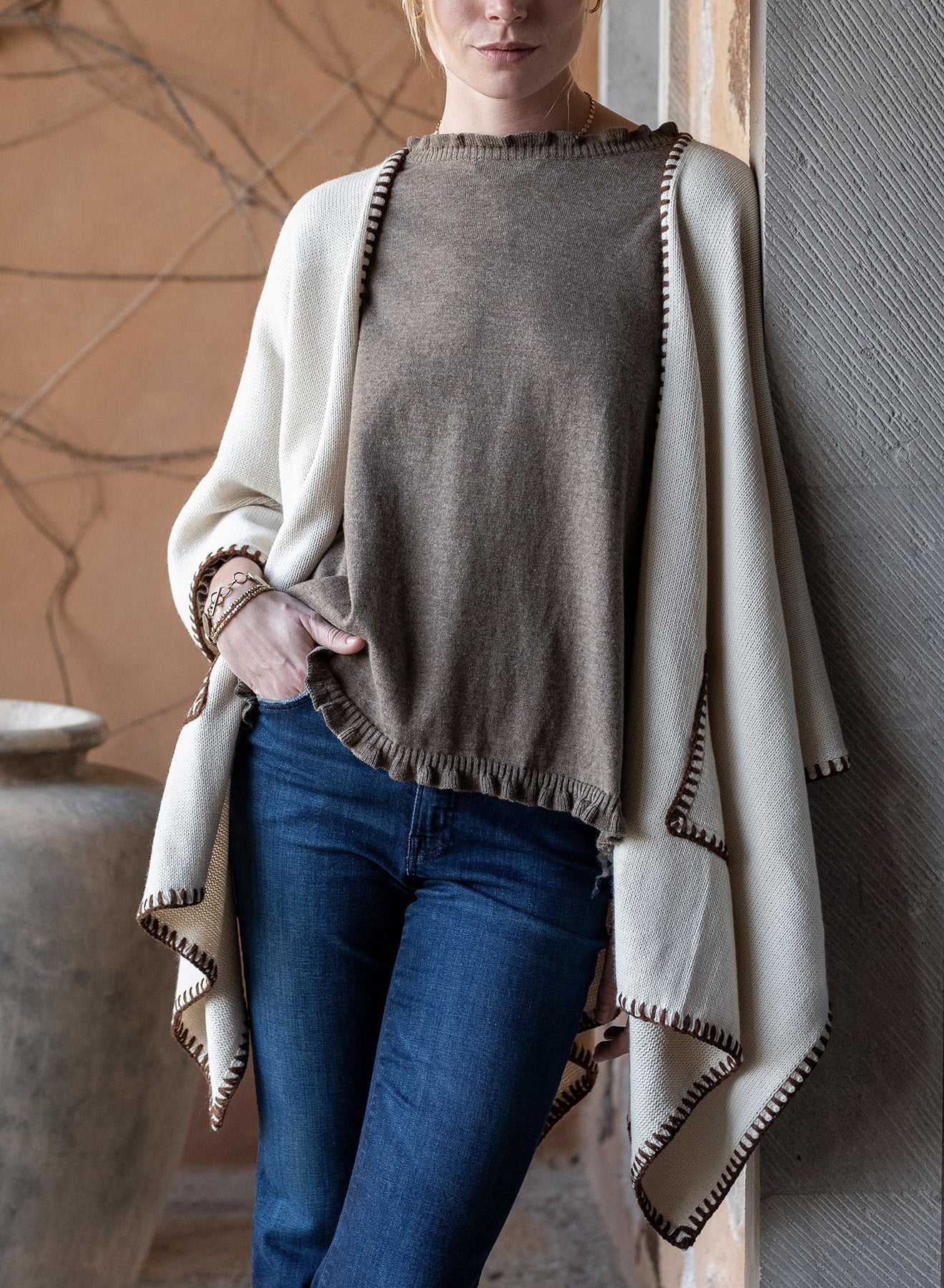 The Mersea Whipstitch Travel Wrap is a versatile layer designed for effortless elegance and cozy comfort. Crafted with a soft, flowing drape, it features beautifully detailed whipstitch trim that adds an artisanal touch to its clean silhouette. Perfect for travel, lounging, or layering over everyday outfits, this wrap offers both warmth and sophistication. Its lightweight design makes it easy to pack, while the open-front style ensures it pairs seamlessly with anything in your wardrobe.