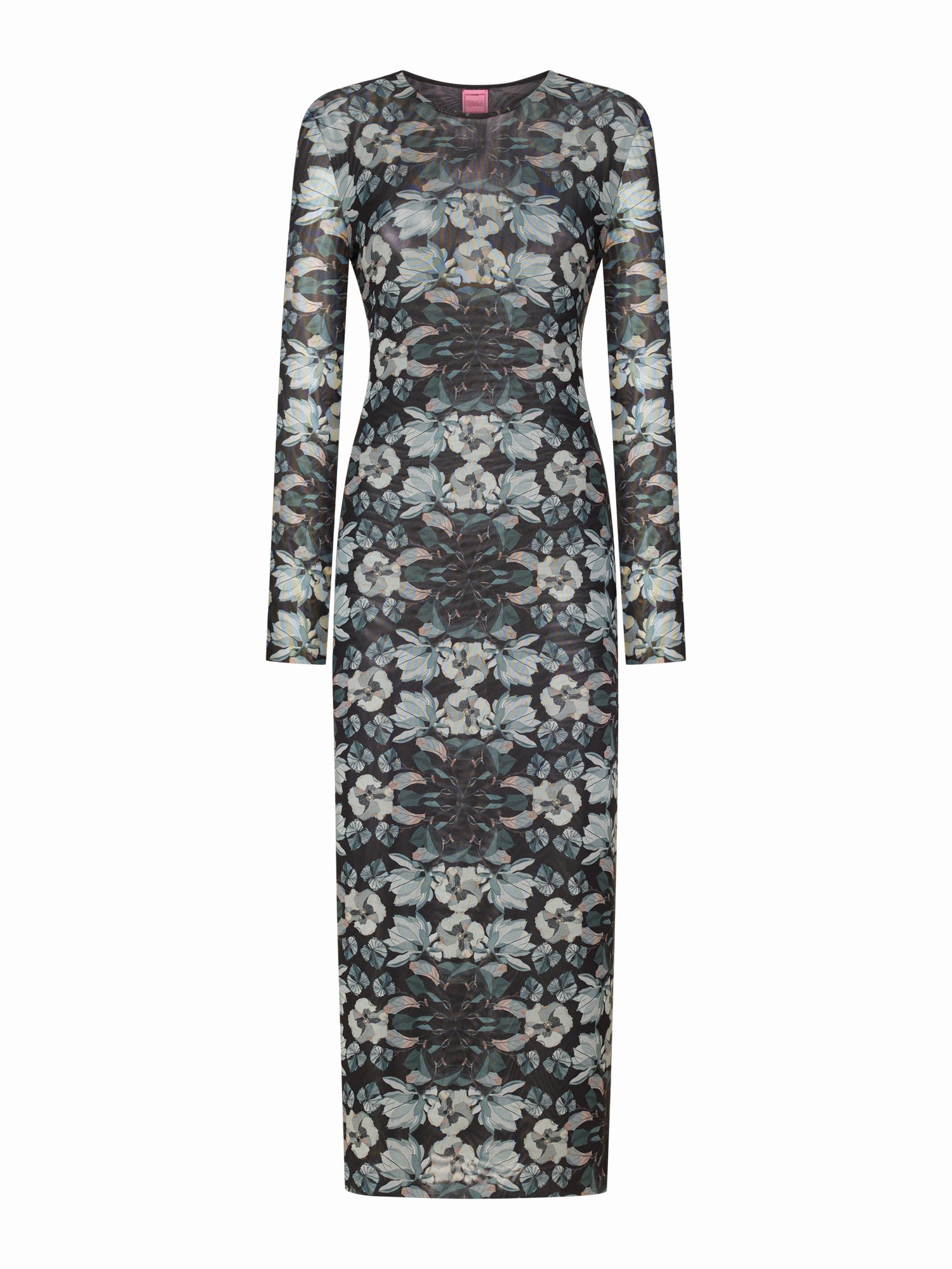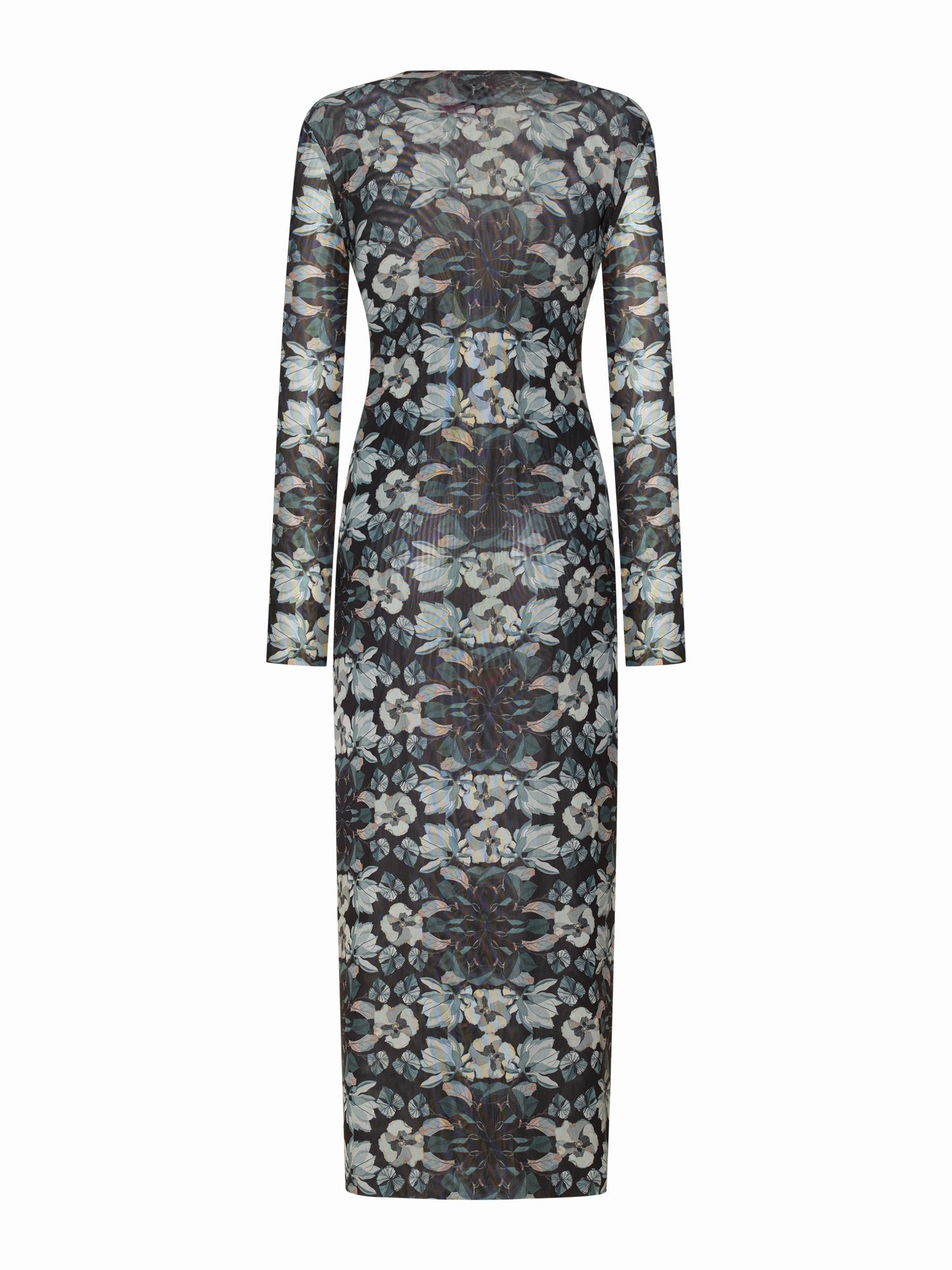 Stretch mesh with body lining; sheer sleeves Slim, figure-flattering silhouette Crew neckline for timeless simplicity Midi length – refined and versatile Botanical print in soft, muted tones