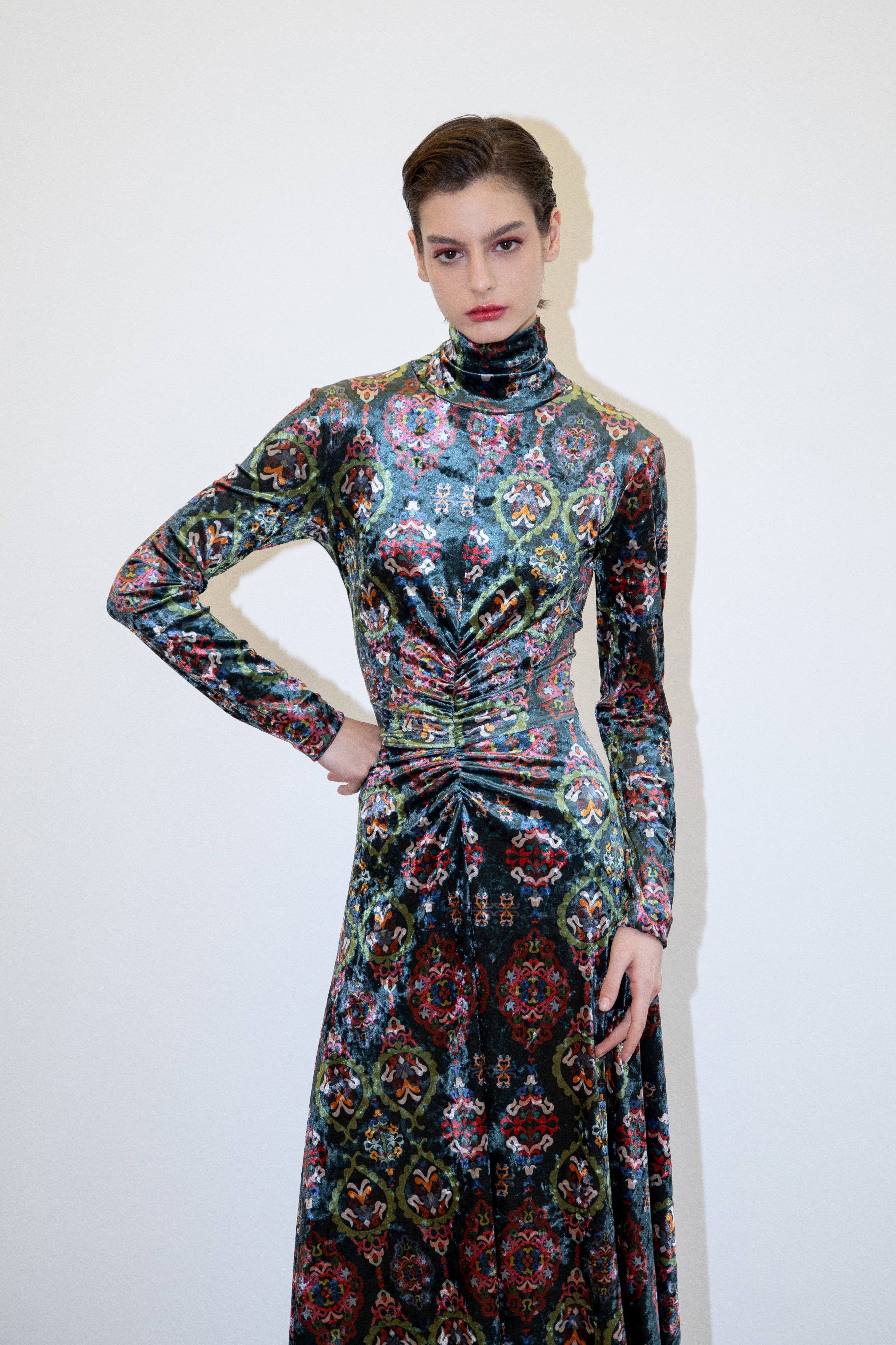 Sumptuous velvet with a soft, luminous finish Ruching at the waist for a figure-enhancing fit Mock neckline and long sleeves for elegant coverage Maxi length with fluid drape for evening sophistication Vibrant jewel-tone floral print for a statement look