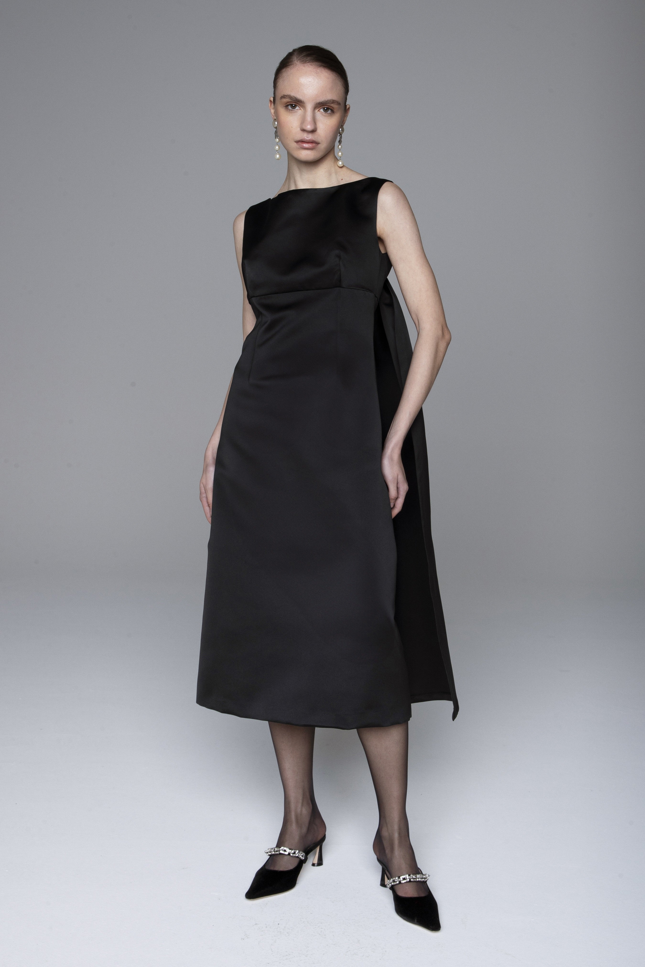 The Lavi Dress is a study in modern elegance, designed in a sleek sleeveless silhouette that drapes effortlessly in lustrous black fabric. It features a boat neckline for refined simplicity and a midi-length hem that balances timeless sophistication with contemporary edge.