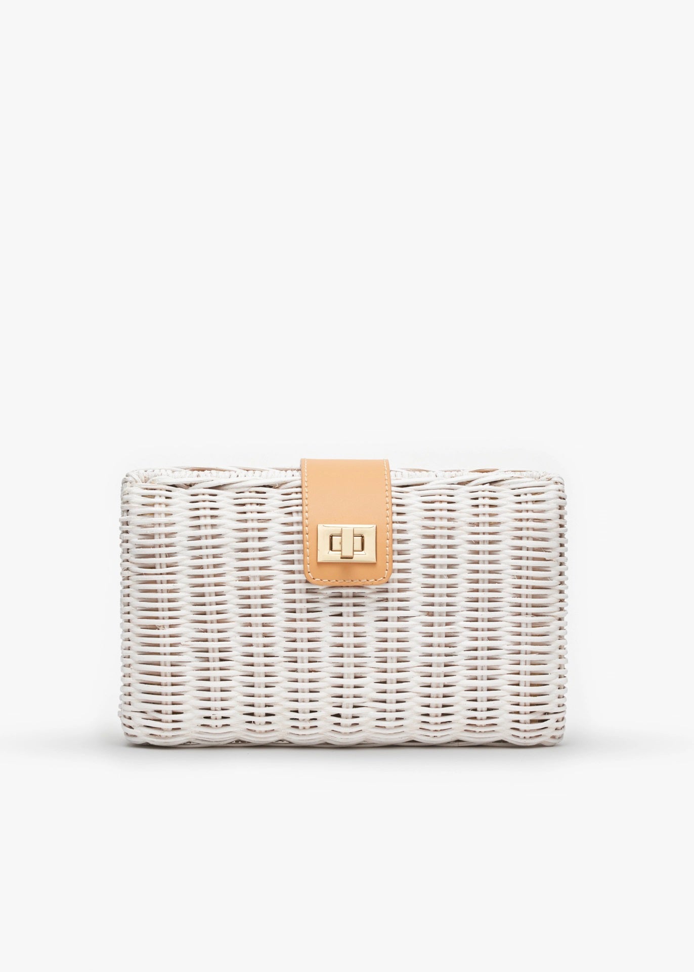 Wicker clutch with gold toned turn lock closure and optional drop-in chain strap.