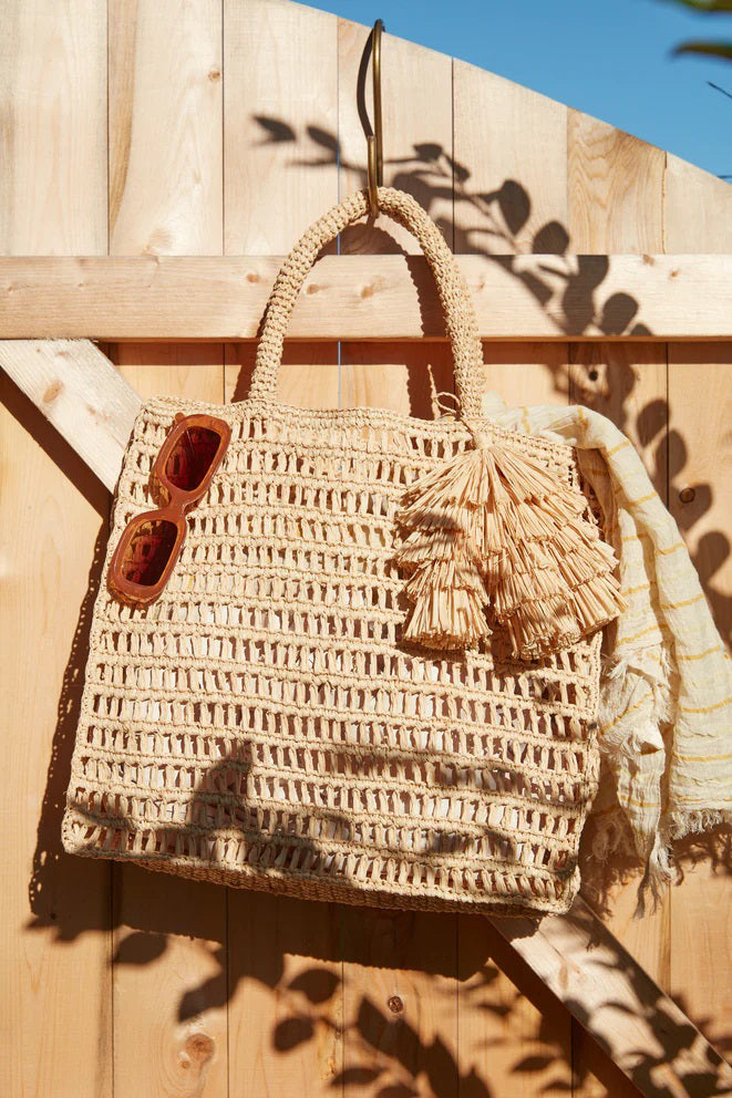 A pretty crochet pattern makes our Georgia tote equally chic for the city or sand. And it's finished with a removable raffia tassel.