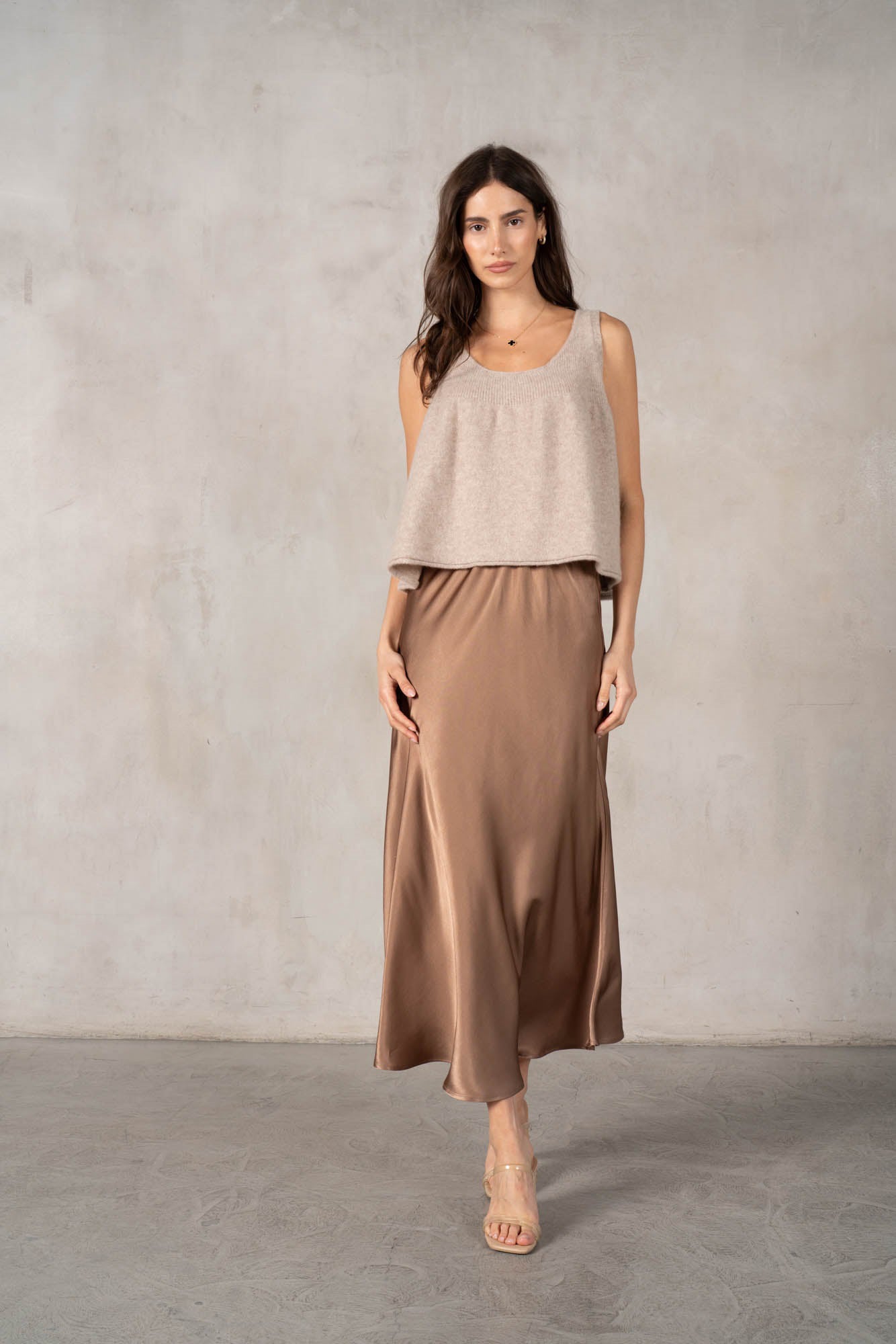 It’s dyed to perfectly coordinate with Rose & Crown’s matching cashmere pieces and satin pants, creating endless mix-and-match outfit options. Whether paired with a fitted knit for a streamlined look or a relaxed blouse for effortless sophistication, this skirt transitions seamlessly from day to evening.