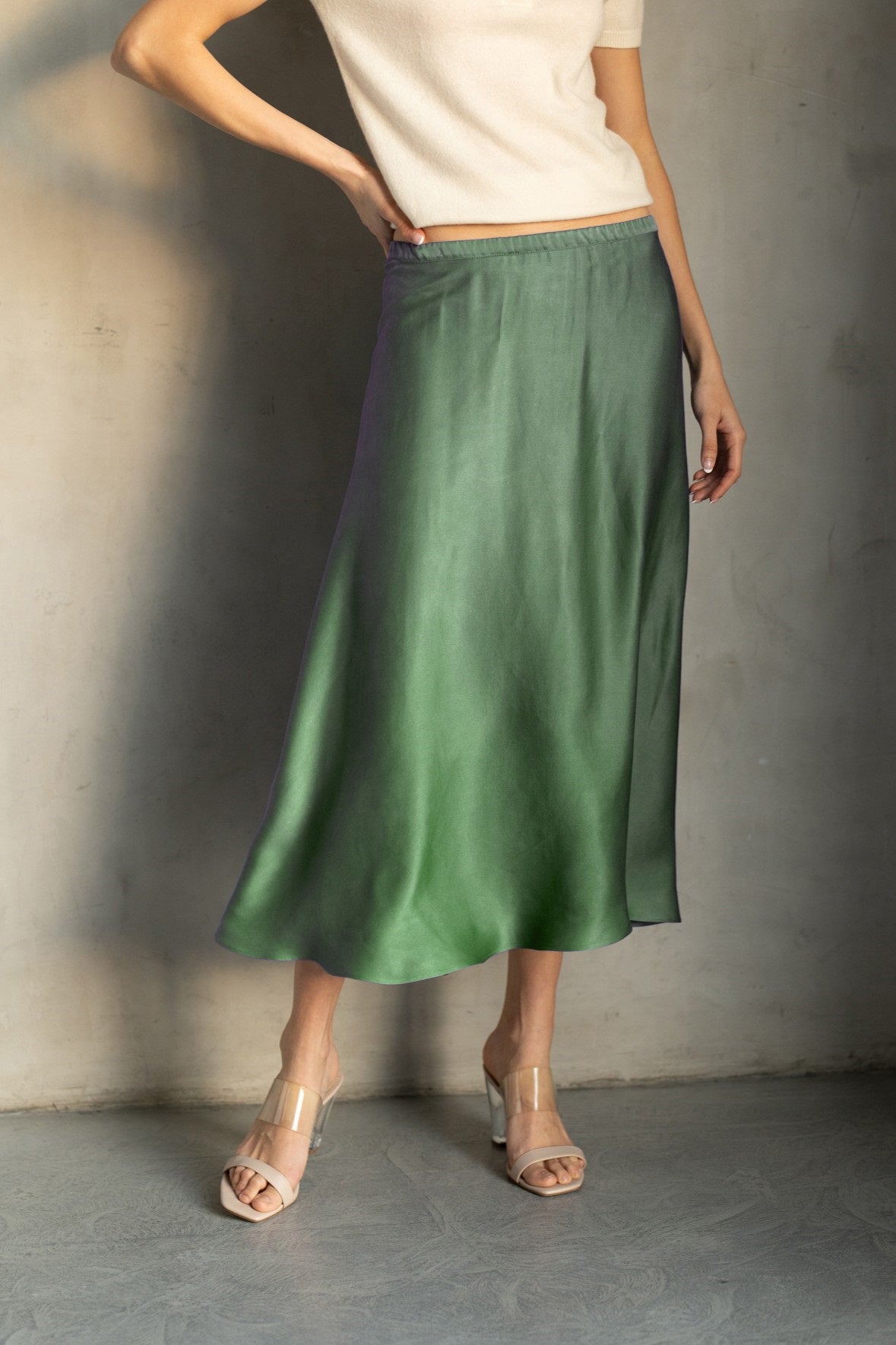 The Rose & Crown Satin Skirt is an elegant wardrobe staple, blending luxurious fabric with an easy, wearable silhouette. Crafted from a lustrous, ribbed satin, it drapes beautifully and moves with a subtle sheen. The design features a comfortable elastic waistband for a flattering fit, while the fluid midi length offers versatility for both casual and elevated styling.