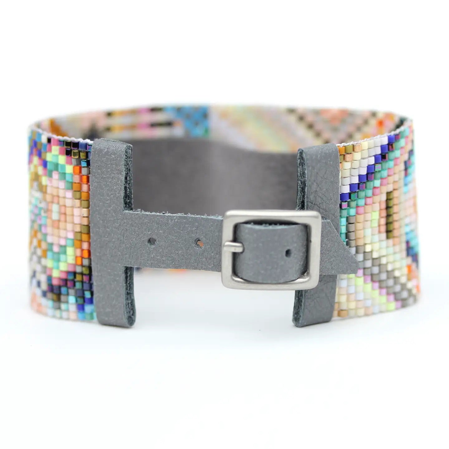 An intricate and colorful mix of pastel, neon and bright beads, geometric abstract design, handwoven glass delica beaded cuff. 1 1/4" width, adjustable buckle clasp.