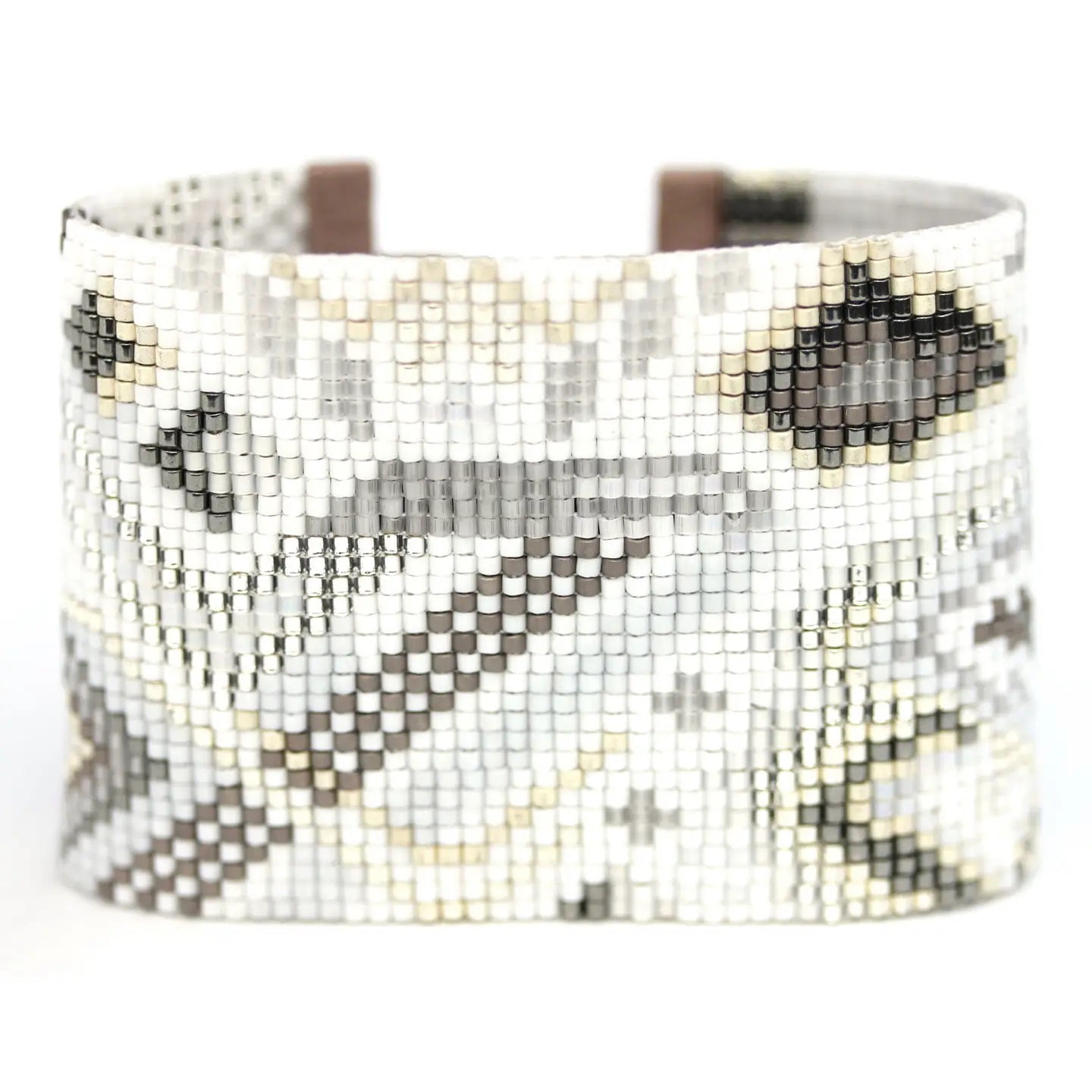 Geode meets geometric with subtle metallic and white hues in the handwoven, glass delica beaded quartz cuff, 1 7/8" width, adjustable buckle clasp.