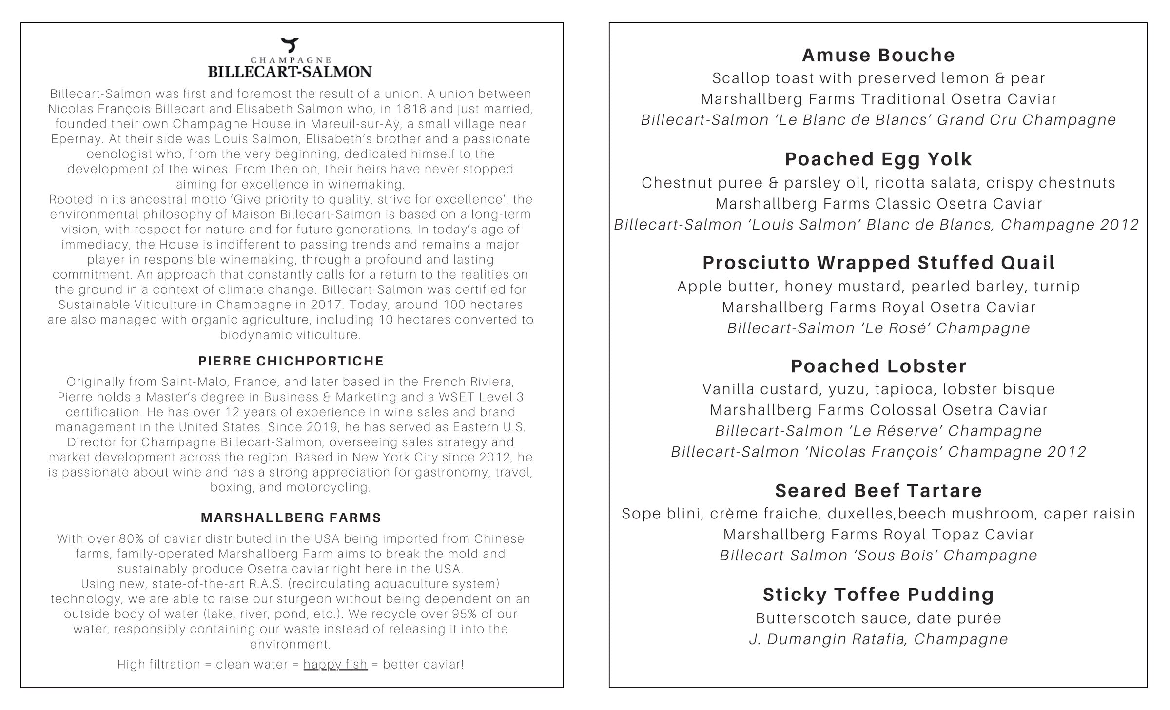 Fearrington is proud to partner with the historic house of Billecart-Salmon Champagne for a memorable evening of bubbles and caviar! Help us welcome Billecart-Salmon’s Pierre Chichportiche to lead us on a memorable evening of select Champagnes paired with caviar-focused custom dishes created by Chef Paul Gagne.
