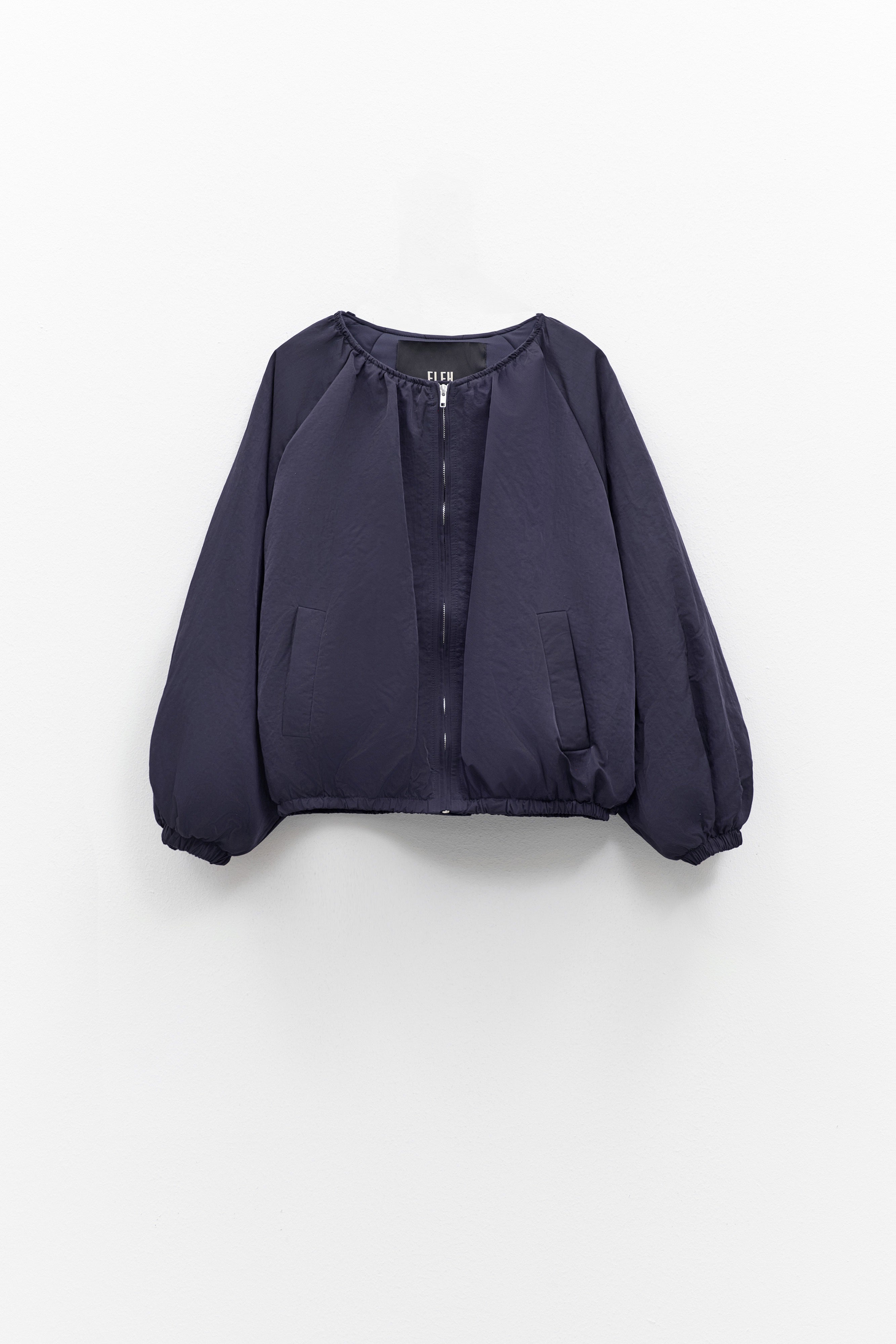 The design embraces volume with cocoon-like proportions: dropped shoulders, balloon sleeves with elasticated cuffs, and a softly gathered hemline that cinches slightly at the waist for a flattering, cropped finish. A zip-front closure gives it versatility, allowing it to be worn open for effortless layering or zipped for a more sculpted look. Side welt pockets add practicality without disrupting the jacket’s clean lines.