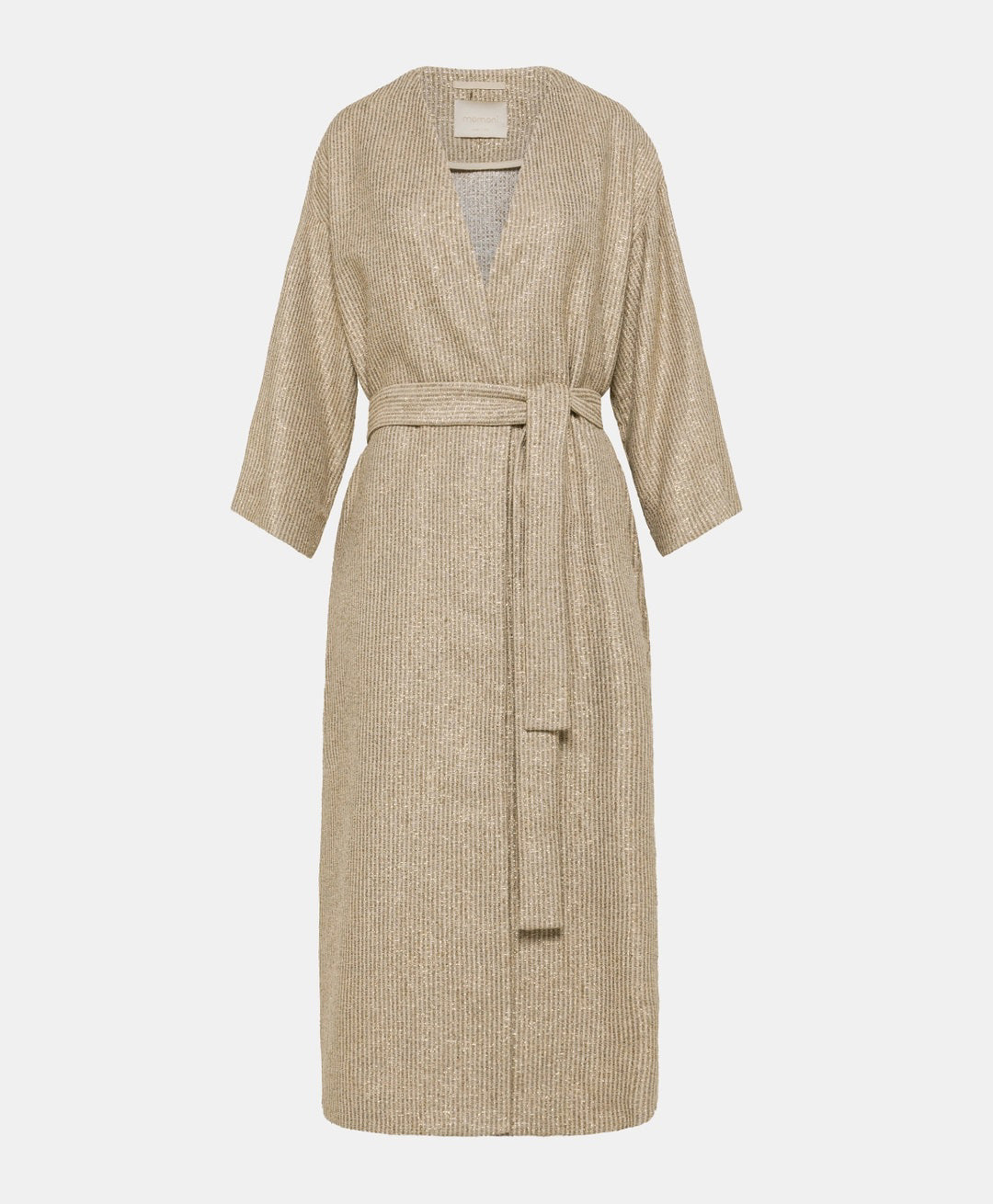 Collarless wrap coat with waist sash in striped lurex basketweave. Long side slits, full sleeves and in-seam side pockets.