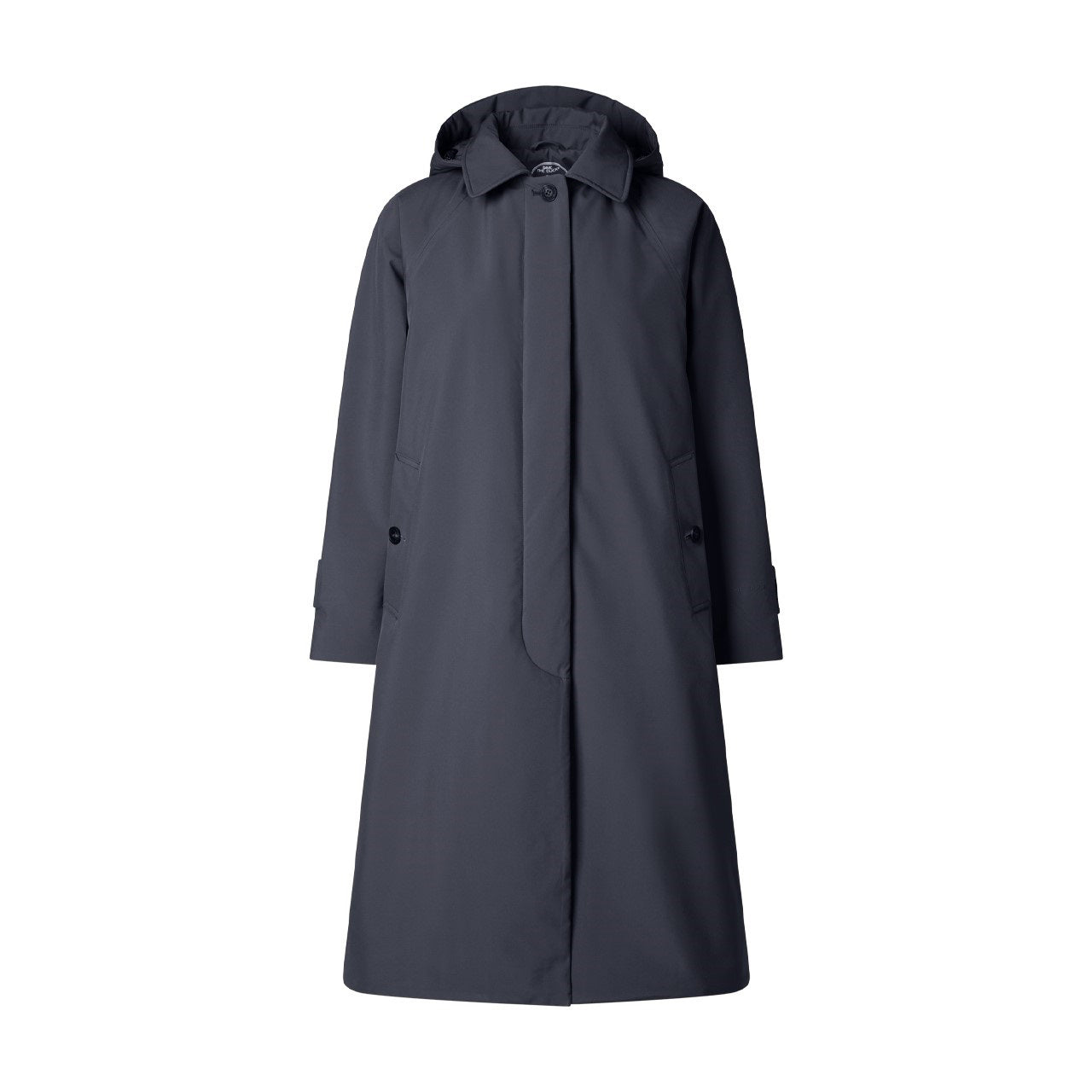 Embrace rainy days with the Zoey raincoat, featuring a detachable hood and raglan sleeves for comfort and mobility. Partially taped seams and insulating padding ensure you stay warm and dry. The main opening is secured with faux horn buttons and a two-way zip, while trench welt pockets offer practical storage. An embossed "Save the Duck" logo on the left sleeve adds a signature touch.