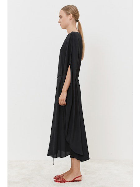 This Meimeij dress, crafted from a luxurious blend of 69% acetate and 31% silk, exudes quiet elegance and architectural grace. The silhouette features a boat neckline, a relaxed drape, and dramatic cape-like sleeves that open along the arms and cascade fluidly to the hem. The construction skims the body gently and falls to a midi length, giving the look effortless movement and polish.