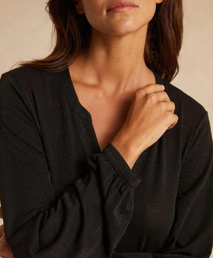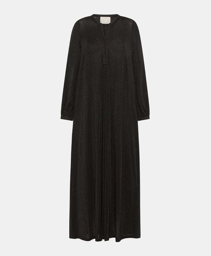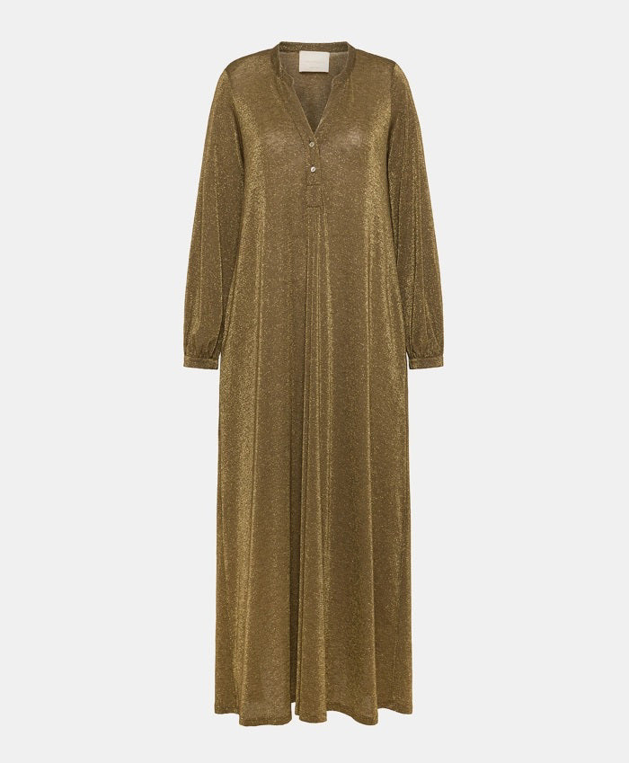 Long dress in soft lurex jersey with V neck, polo shirt opening with buttons and buttonholes. Sleeves gathered into band cuff. Made in Italy.