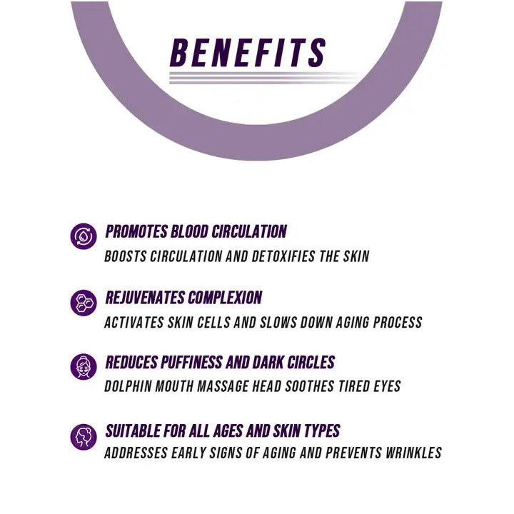 This tool promotes blood circulation, detoxifies your skin, and rejuvenates your complexion. The dolphin mouth of our tool can be used to massage and soothe tired eyes, reducing puffiness and dark circles.