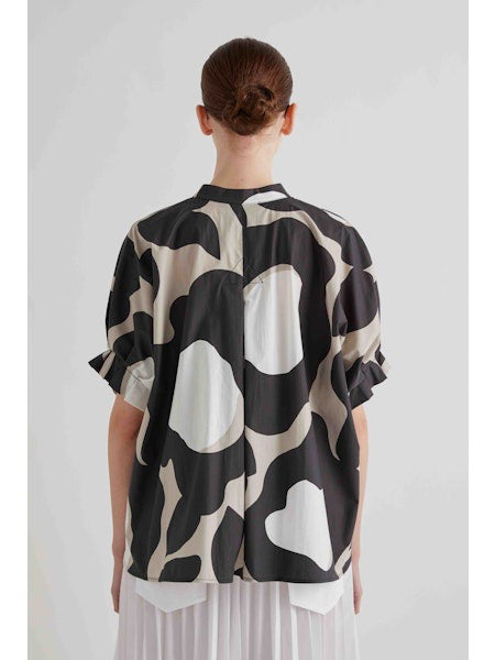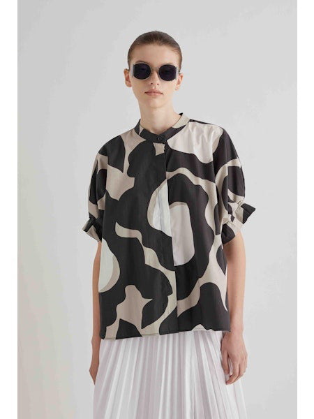 Made from lightweight cotton, the top features Meimeij’s signature “Moonbeam” abstract print, rendered in a sophisticated palette of black, soft ivory, and muted taupe. The organic, flowing shapes create visual movement while maintaining a refined, contemporary feel.