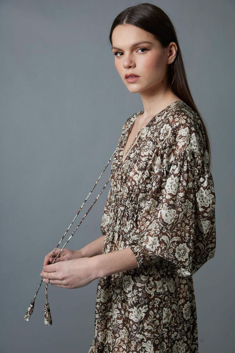 Shirred bodice dress has self flower tipped drawstring ties at the front chest, elasticated waist and a full, tiered skirt. Long, full sleeves have smocked cuffs! Side seam pockets.