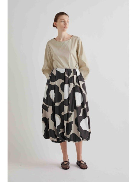 Crafted from crisp cotton, the skirt features an abstract, organic print in a refined palette of black, soft ivory, and warm taupe. The pattern feels modern and artistic rather than literal, giving the piece visual impact while remaining timeless.