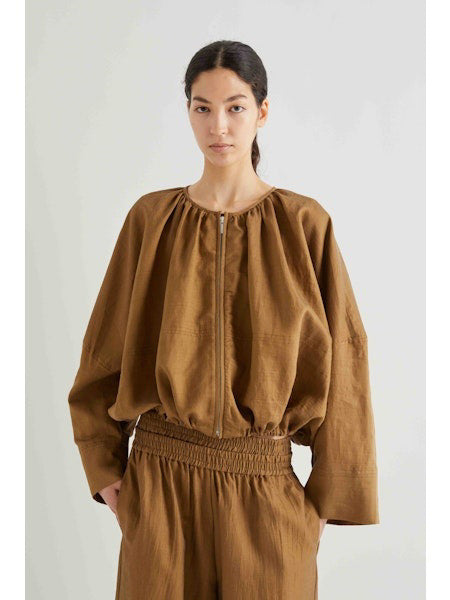 Crafted from lightweight fabric in a warm earthy brown, the jacket features a gently gathered neckline that creates natural drape and subtle texture across the shoulders. A center-front zip closure adds a clean, contemporary edge while keeping the design minimal and functional.