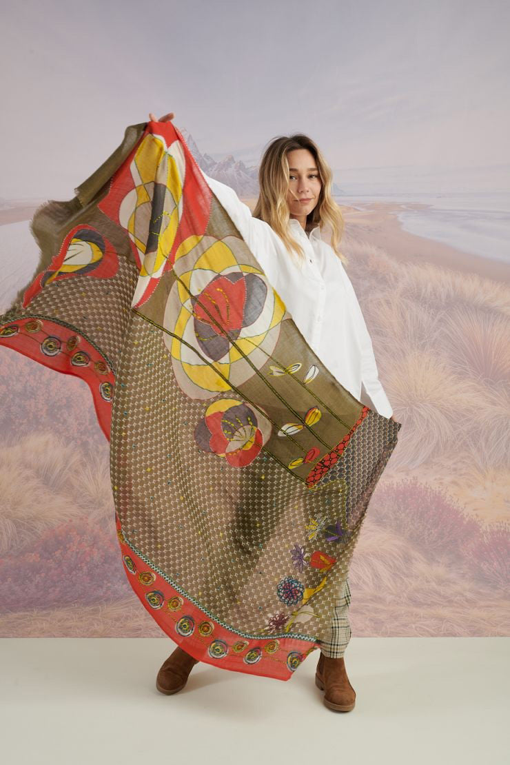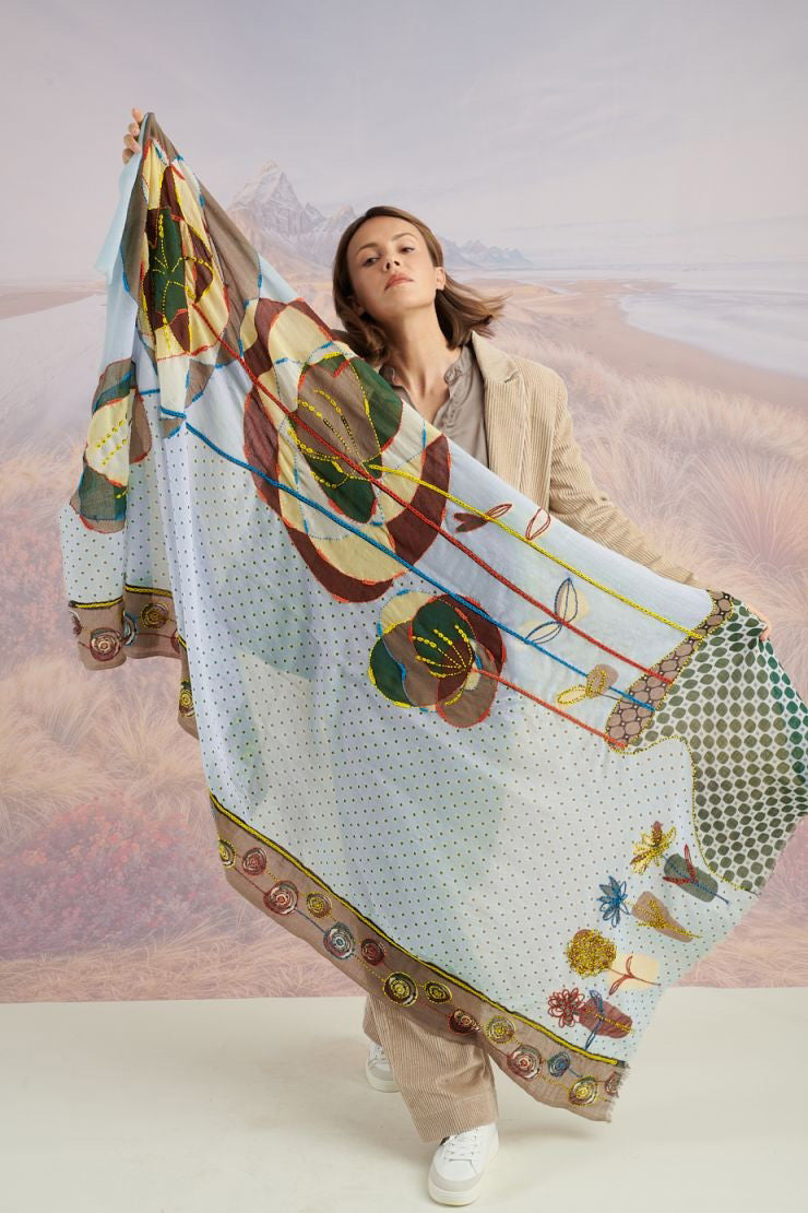 Carefully crafted, our wool scarf is distinguished by its hand-embroidered details, adding a touch of elegance to your style. Dimensions: 100 x 200 cm Composition: 100% wool with embroidery Care instructions: Dry clean