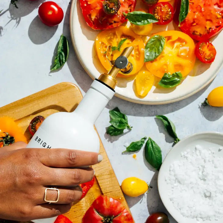 Fits in - and looks beautiful with - all full size Brightland olive oil bottles. (please note: the spout does not fit our 100mL mini bottles or our vinegars)