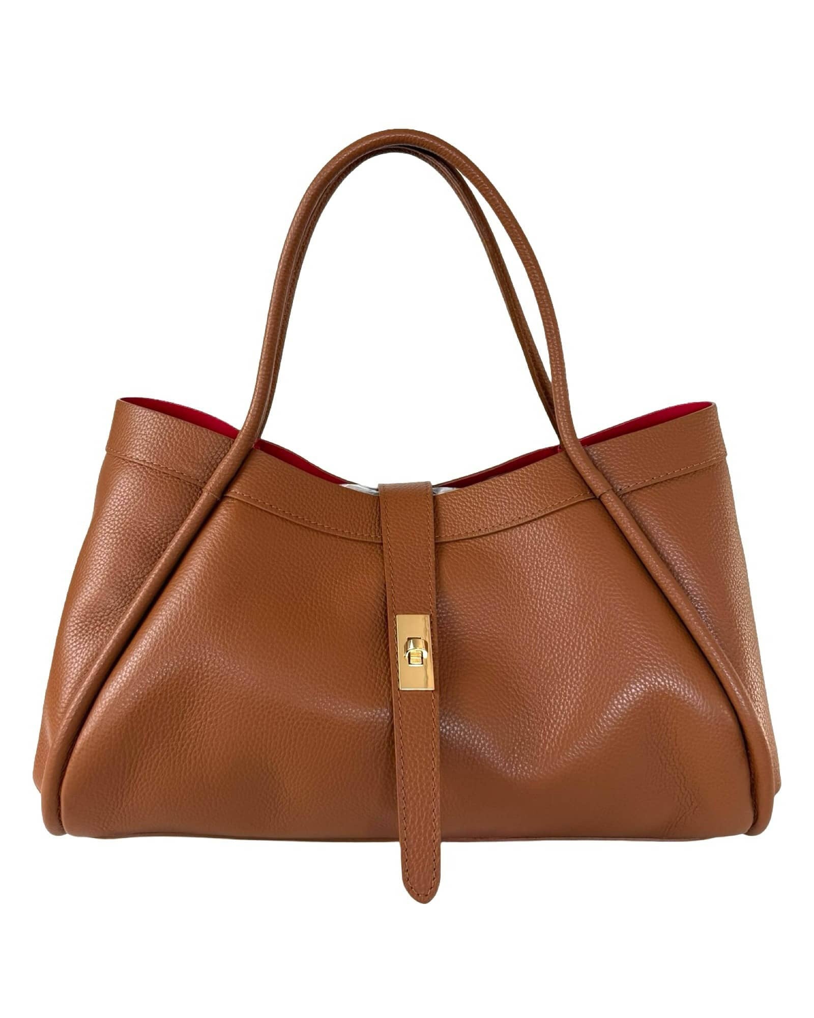 This leather tote bag is a timeless investment piece, offering both elegance and functionality. Its rich color, structured yet flexible shape, and contrasting interior make it a versatile and stylish companion for any occasion.