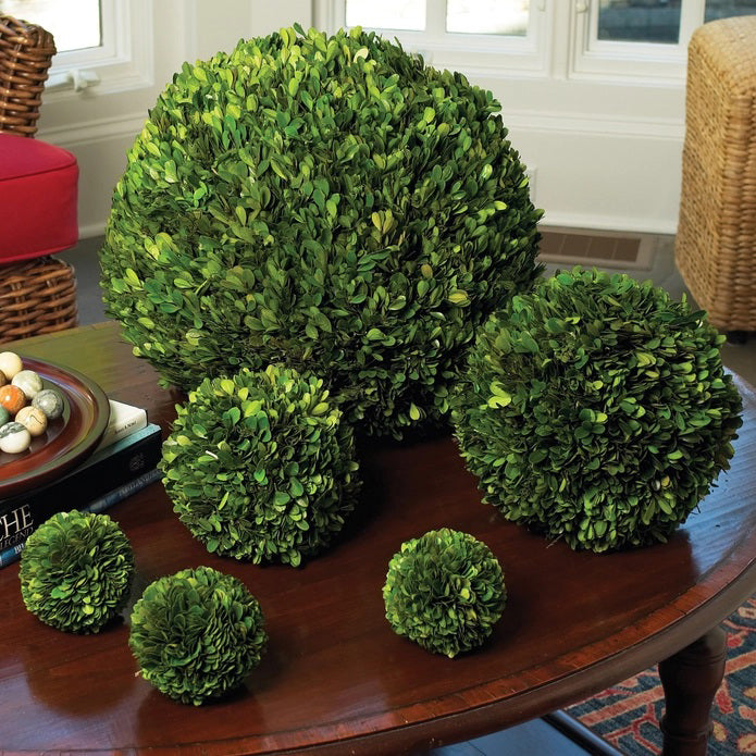Real English boxwoods, preserved and painstakingly assembled by our masterful artists. Artfully arranged and preserved to perfection. 6 x 6 x 6. Intended for indoor use. Keep away from direct sunlight to help minimize fading. Lightly mist with water in dry arid environments. Excessive misting will cause mold and mildew. Avoid damp, dark and humid conditions.