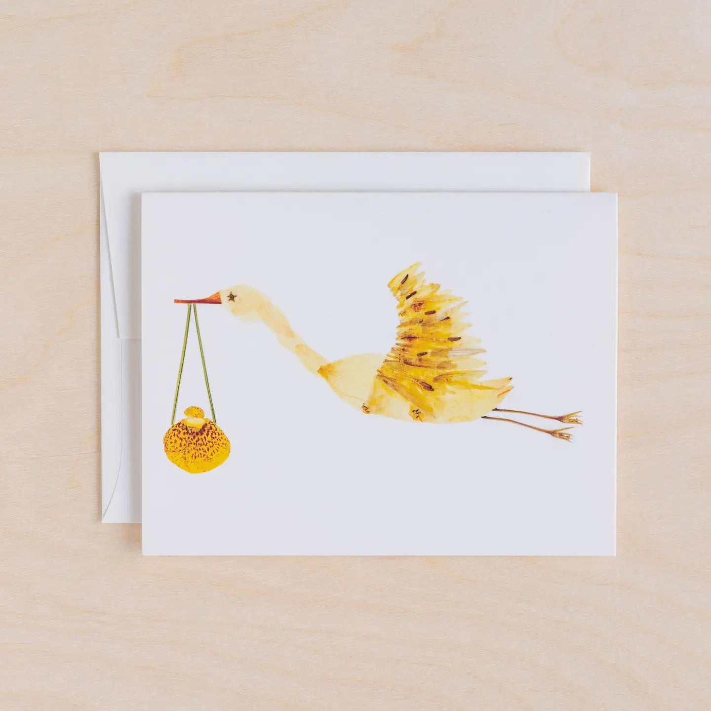 A whimsical card designed entirely from pressed botanicals that I grew in my garden! Featuring the blossoms of Trout Lily, Pocketbook Plant, California poppy and more, it's the perfect card for a new baby, baby shower or adoption celebration.