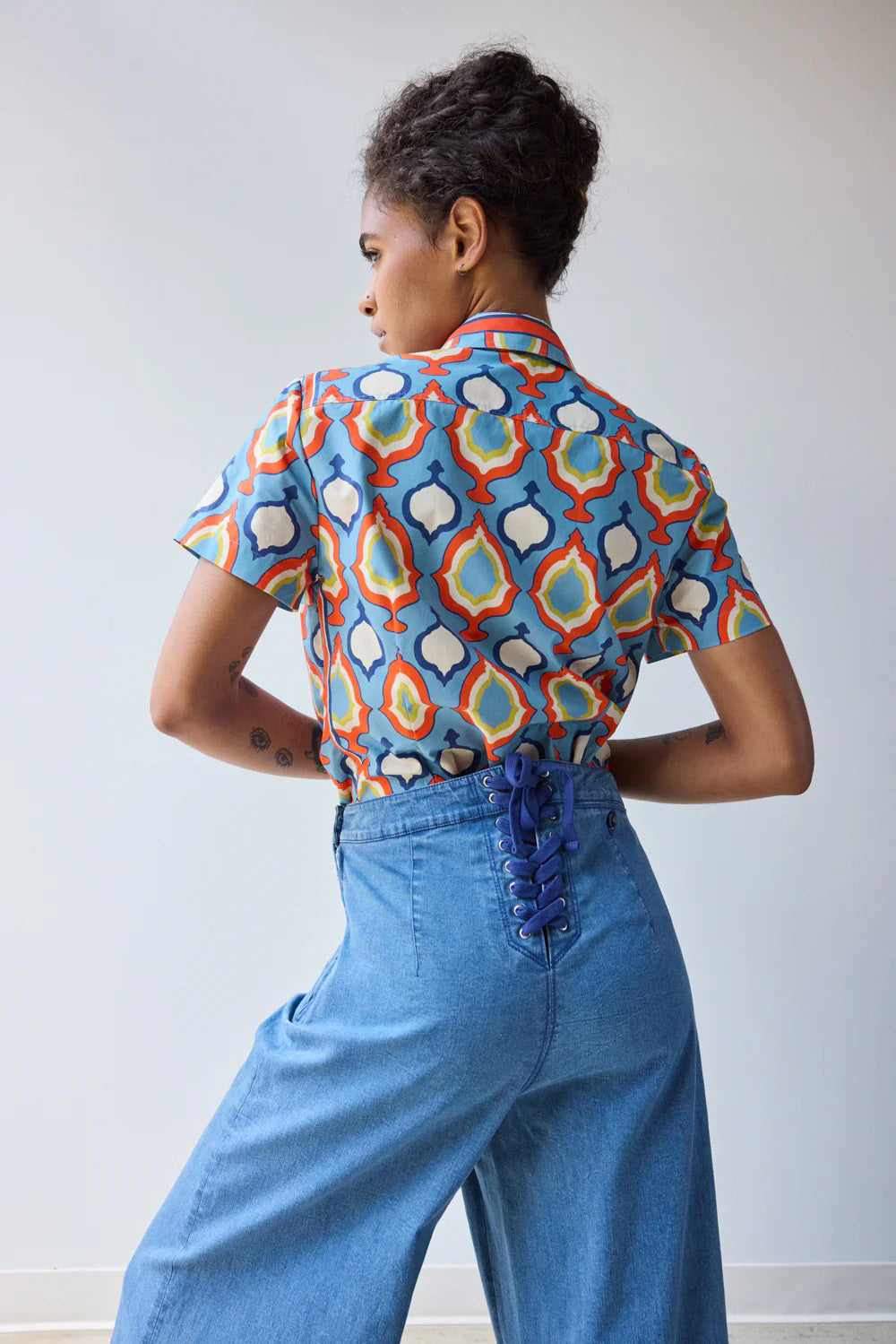 Short sleeve fitted button down shirt with a border printed scarf neck tie.