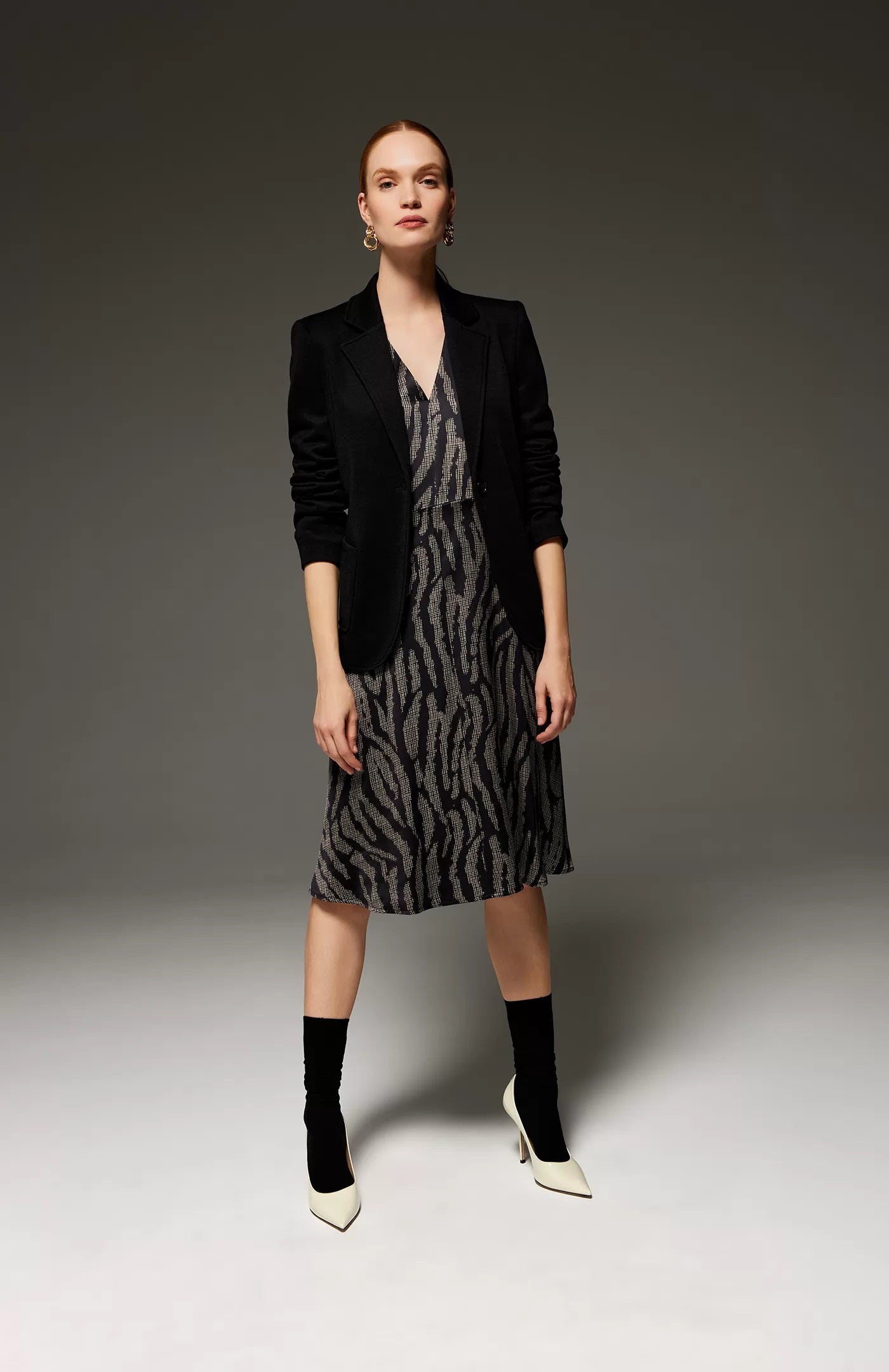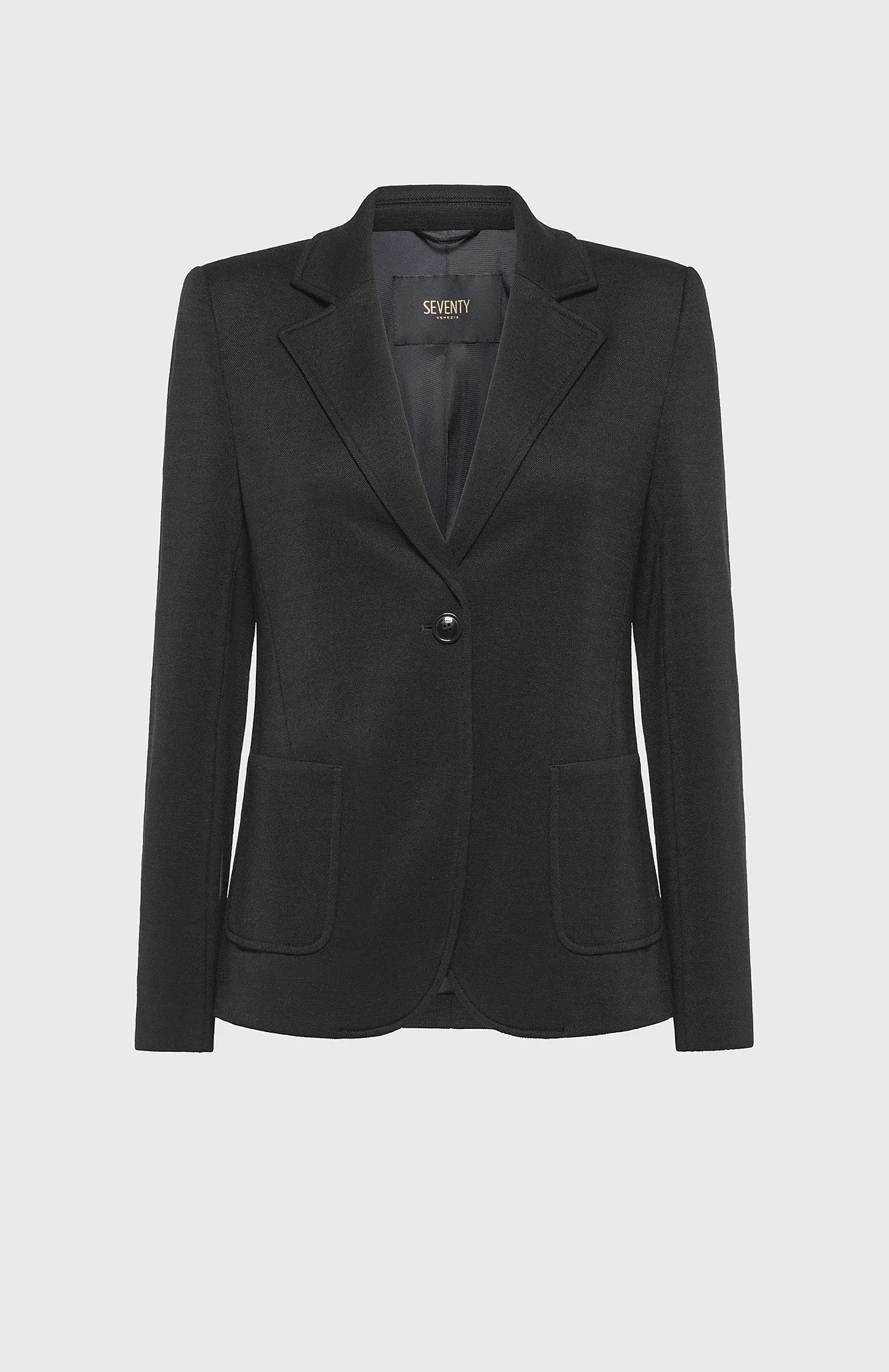 Single-breasted jacket made of stretch textured knit. Classic lapels and fitted long sleeve. Single button fastening and patch pockets.
