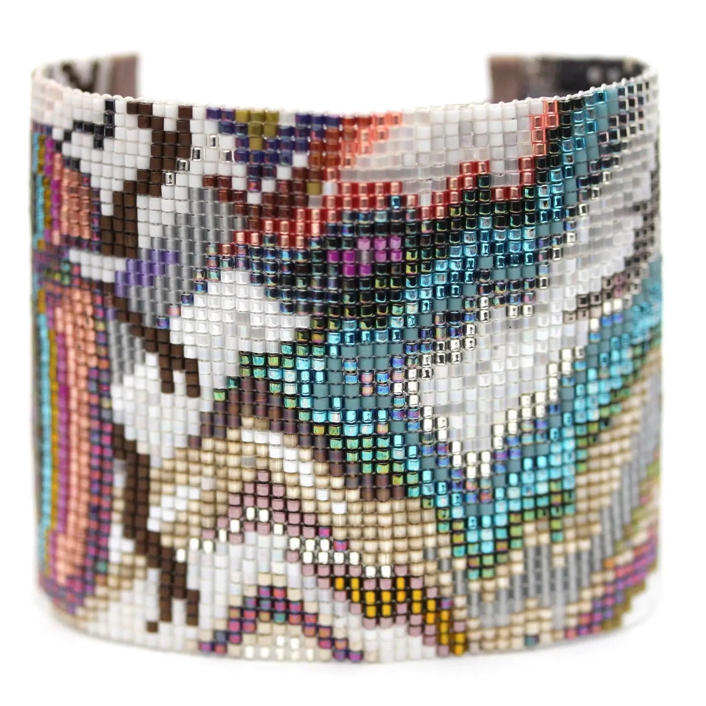 inspired by colorful agates this bracelet also has an image of a scarab on one side, handwoven glass delica beaded bracelet, 2.5" width, adjutable buckle clasp.