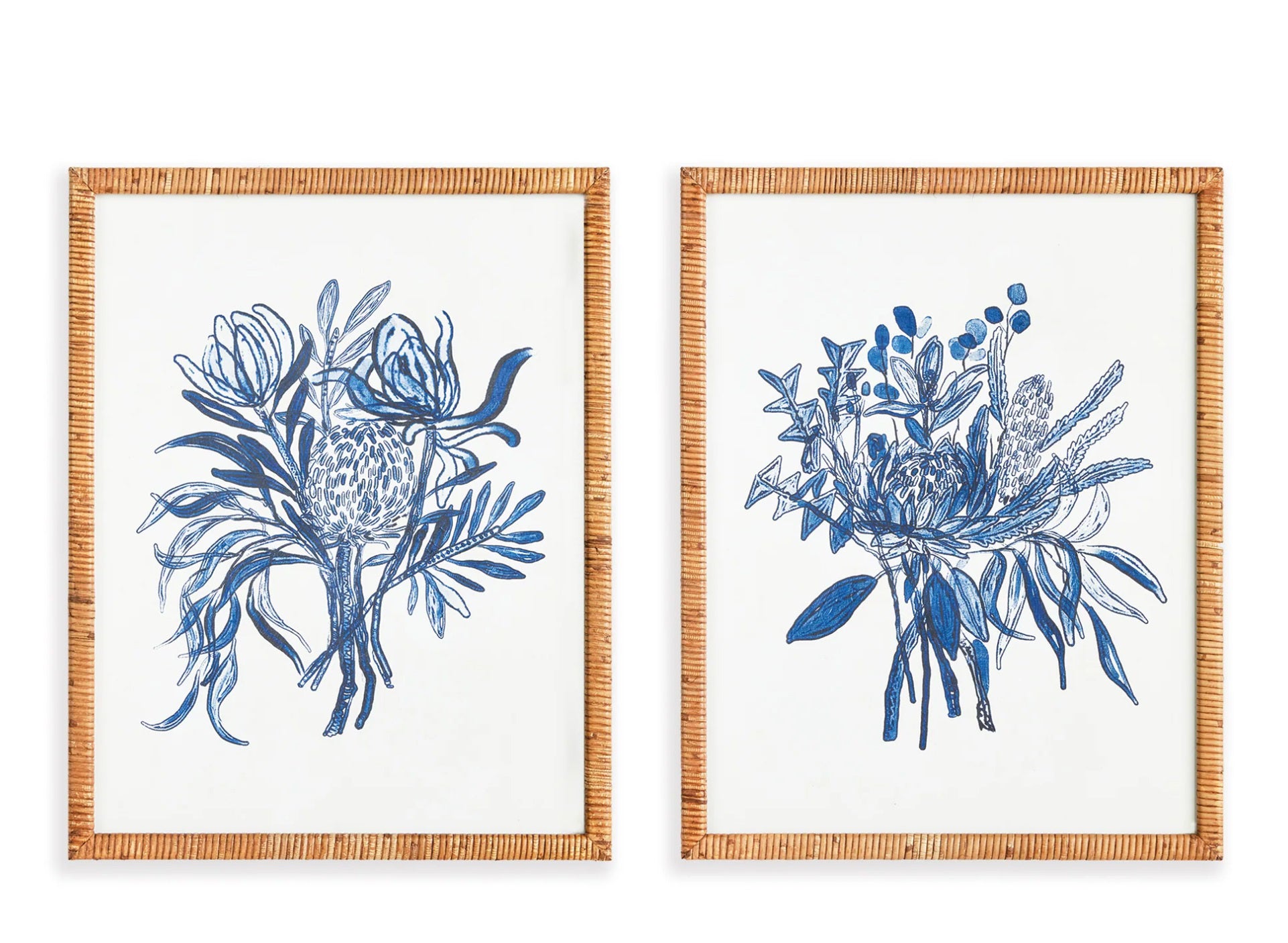 This monochromatic pair of whimsical floral bouquets are impressive in scale. Finished off with rattan wrapped frames, they are a lovely pair for bedroom, study or guest bath.
