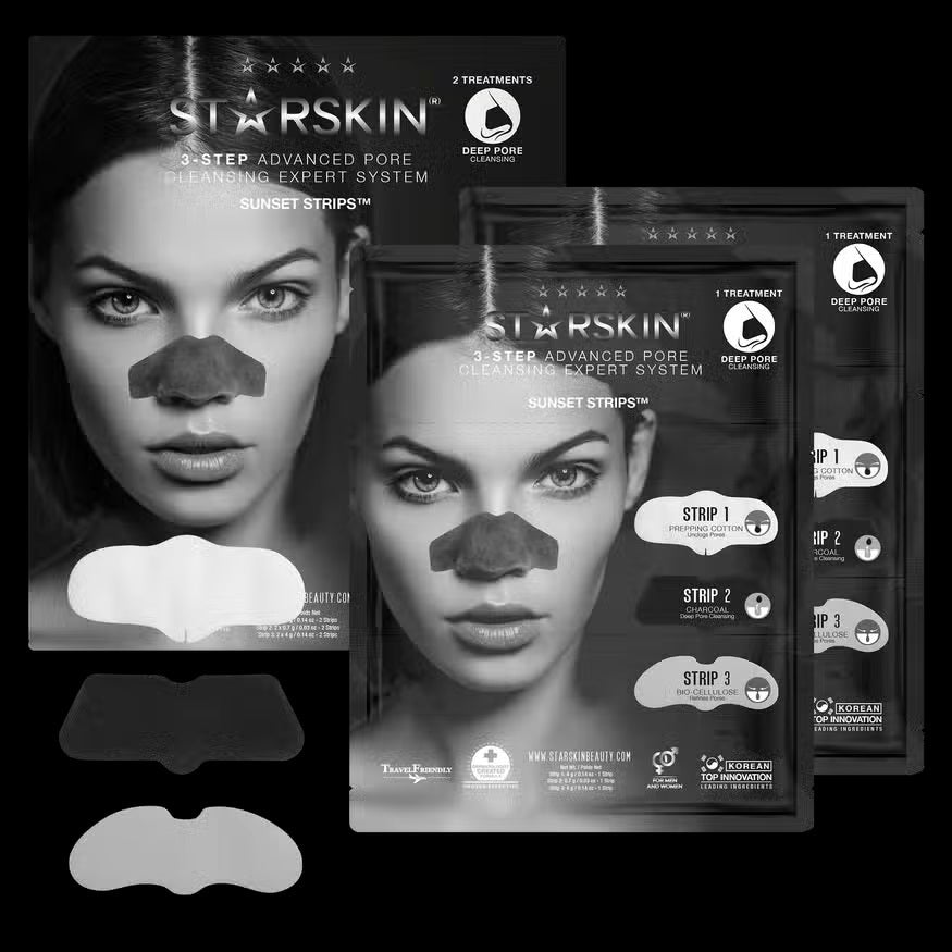 Sunset Strips are a new-generation 3-step deep pore-cleansing and refining system that methodically removes trapped dirt, excess sebum and impurities on the nose without harsh extraction.