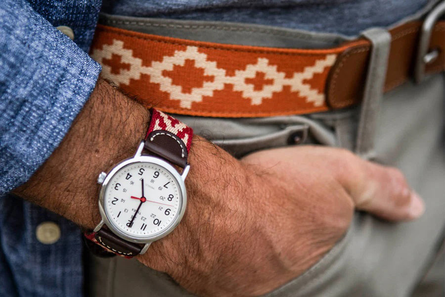 This beautiful fabric is woven by hand and meticulously stitched onto genuine naturally tanned leather that undergoes a distinct conditioning process, giving it an unrivaled look and feel. Enjoy the character of the leather as it improves with time, designed to patina and become a cherished addition to your wardrobe.
