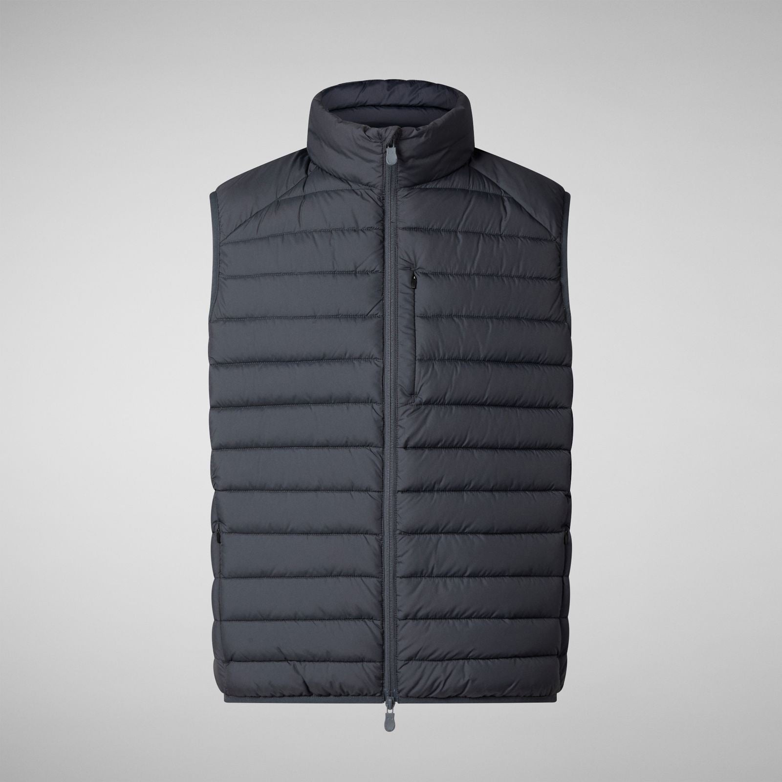 A practical and versatile option for seasonal layering, our Rhus model men's puffer vest features a quilted design complemented by a stand-up collar. Elastic trims on the bottom and armholes ensures a comfortable fit, while the two-way closure and zippered side and chest pockets add functionality. Signature details include custom zipper pulls, a round badge, and the animal-free Recycled Plumtech® padding.