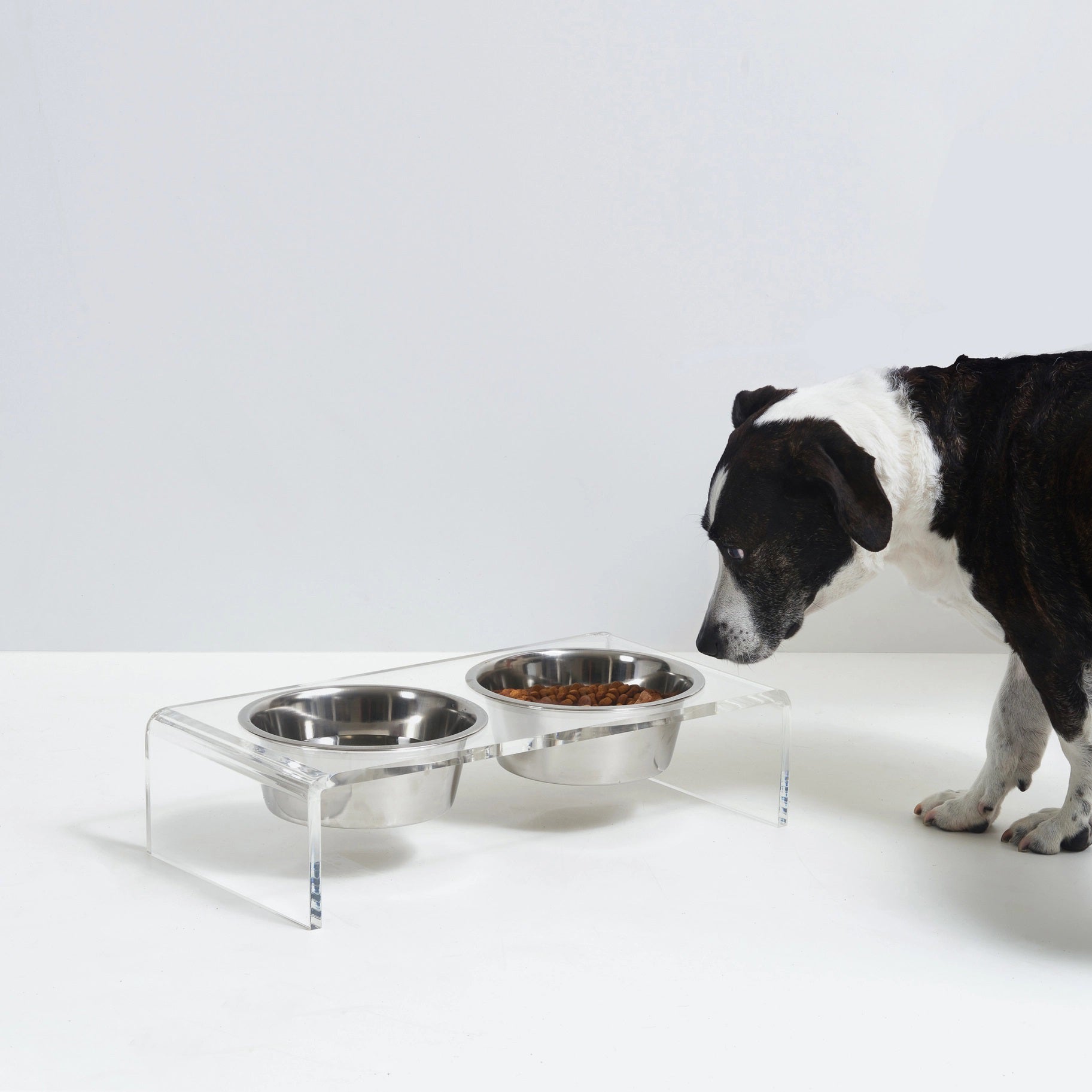 This elevated double bowl feeder is made of thick clear acrylic with curved edges and includes two removable lead-free stainless steel bowls. The slightly raised design provides an ergonomically correct eating position and gives the sleek metal bowl a floating effect - the magical “disappearing” act for those who don’t pet products to interrupt their interior design.