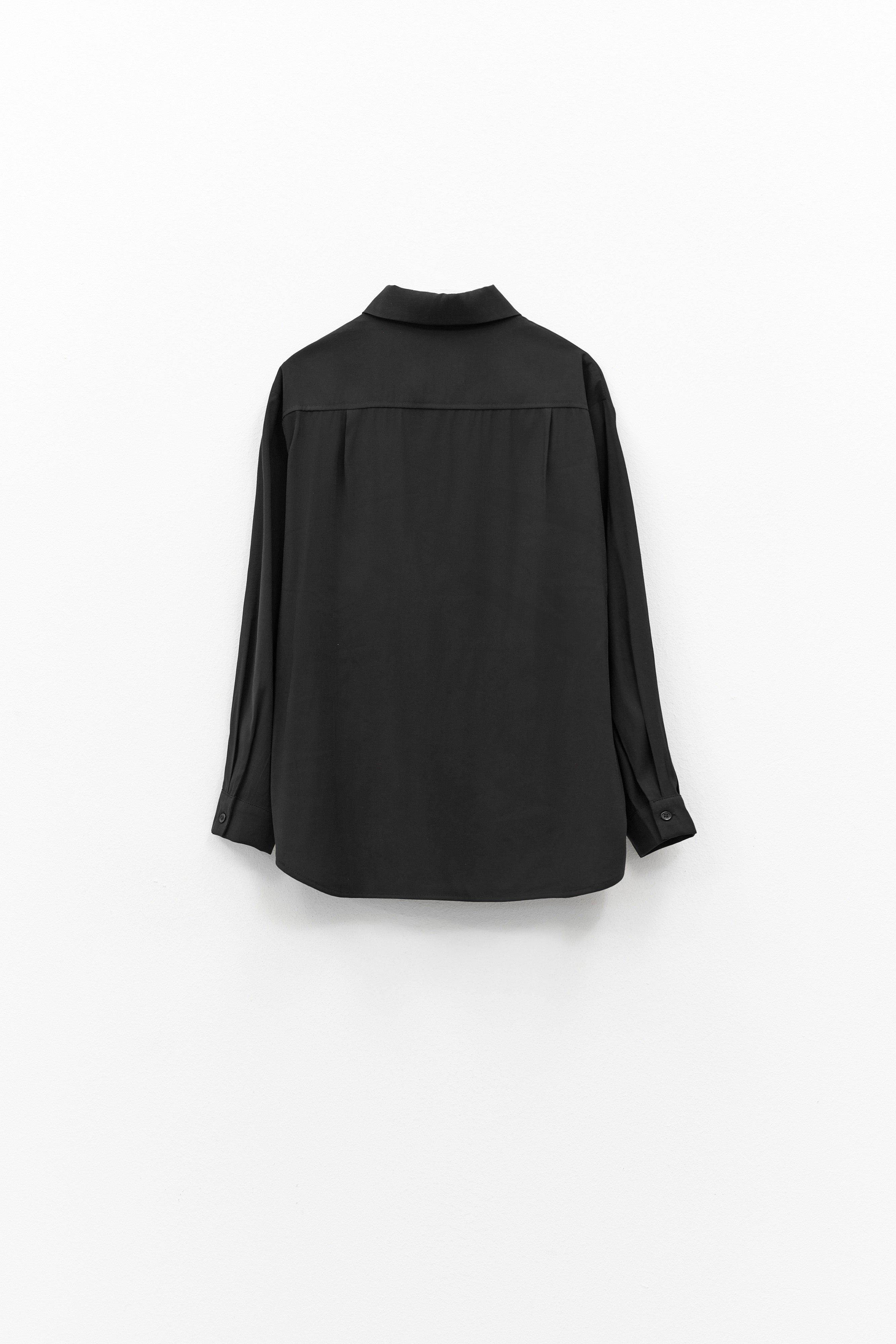 Cut with clean lines, it includes a sharp pointed collar, a front button placket with tonal buttons, and a single chest pocket for a subtle utilitarian touch. The back yoke and gently gathered detail add depth to its structure, while the buttoned cuffs refine the long sleeves for versatile styling.