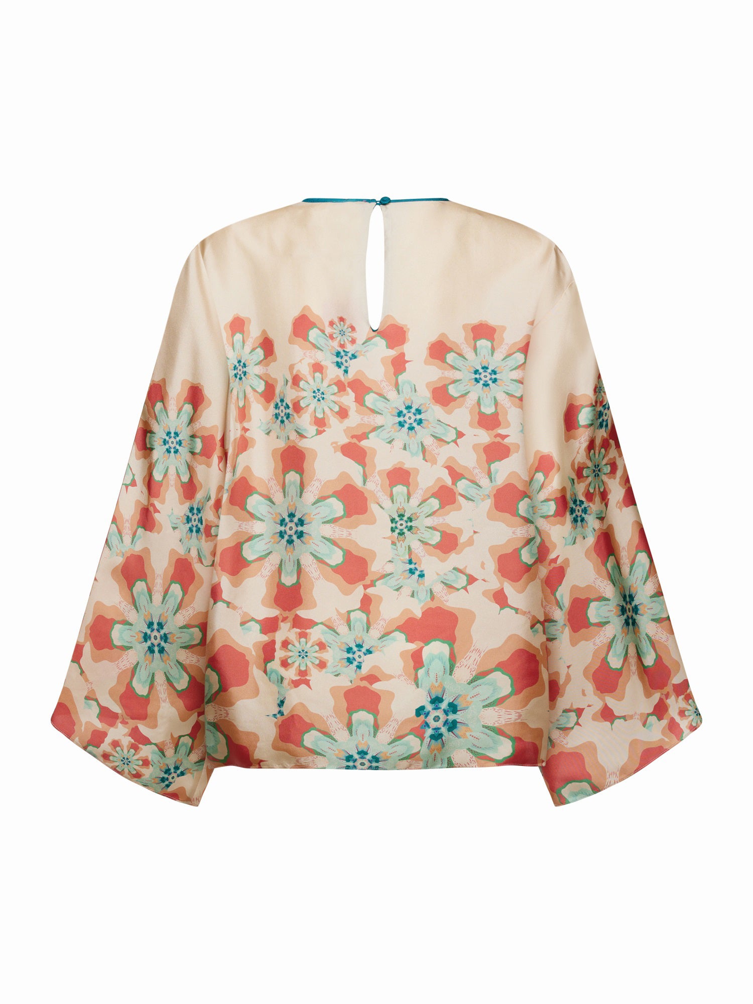 Loose and flowy with wide kimono-style sleeves, giving it a relaxed yet refined shape. A round neckline trimmed with teal piping and finished with a keyhole back and button closure for a delicate touch.