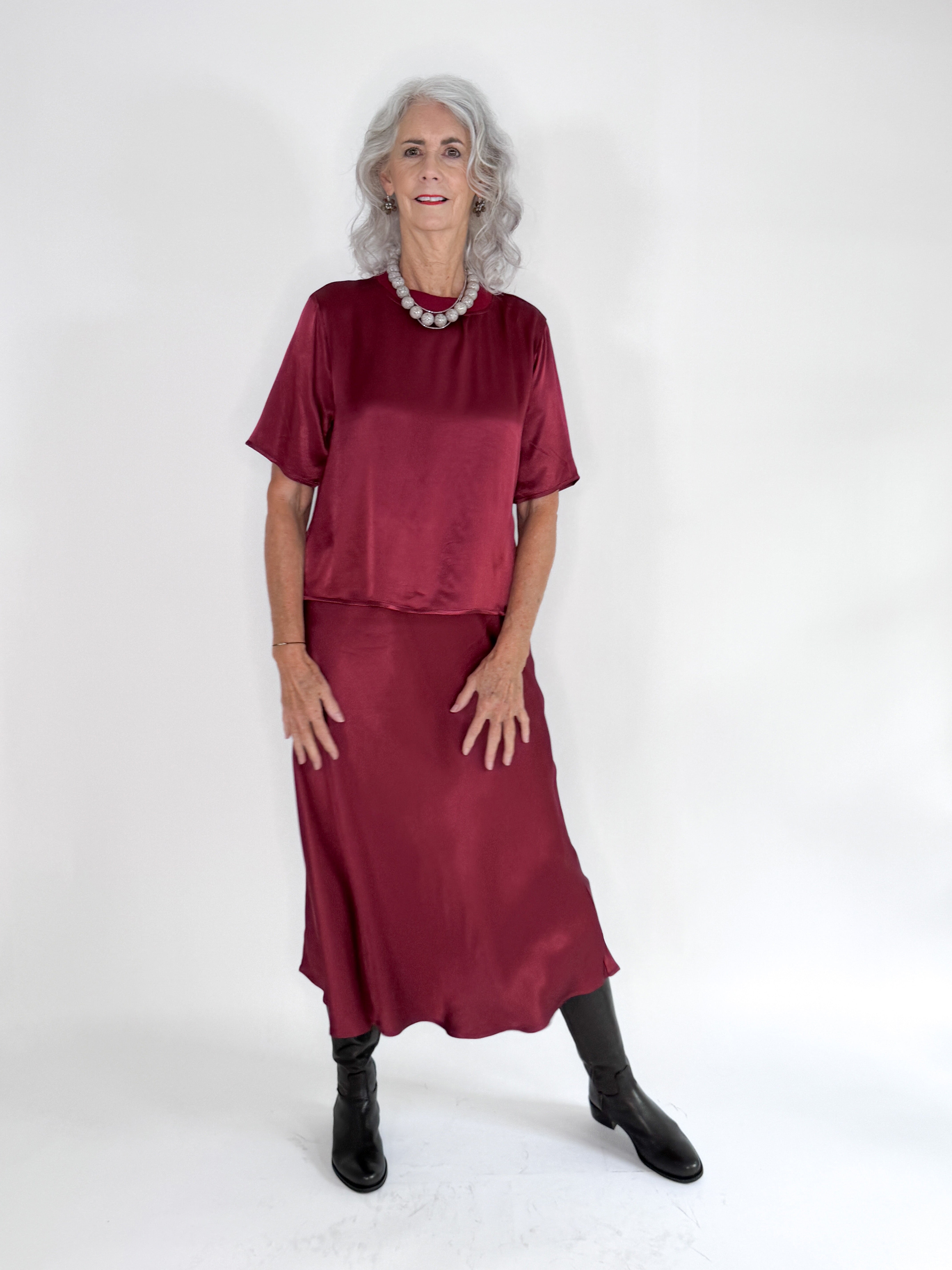 Effortlessly refined, this Rose & Crown short-sleeve tee is crafted from fluid satin that drapes beautifully over the body. The smooth, lustrous finish gives it an elevated feel, while the relaxed cut offers ease and comfort. A clean crew neckline frames the face, and the back features a discreet button-and-loop closure for a polished touch. Designed to pair seamlessly with the matching satin skirt or pants, this piece transitions effortlessly from day to evening.