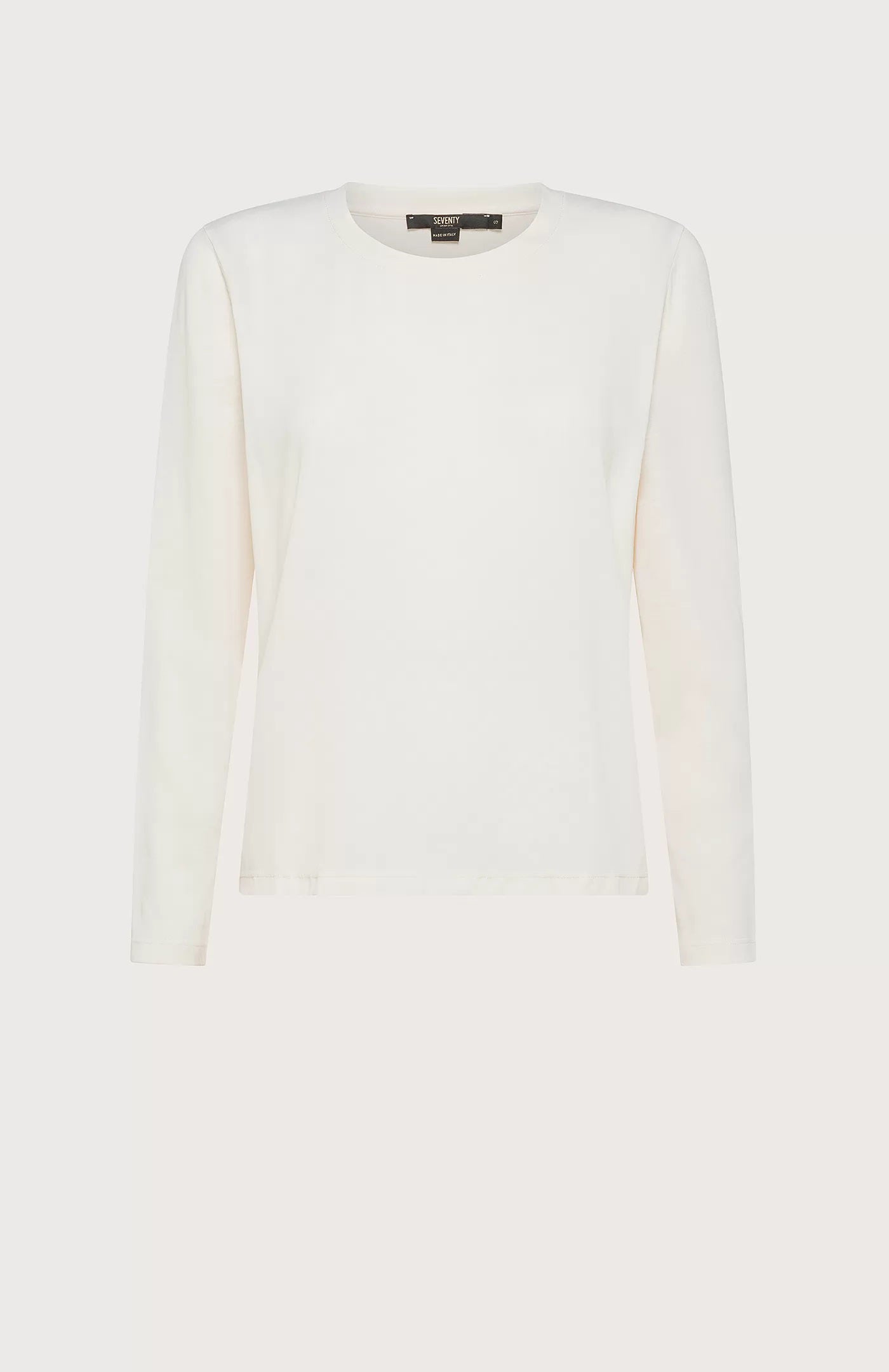 Crew-neck T-shirt with bi-material long sleeves. Silk-blend crepe front and jersey back.
