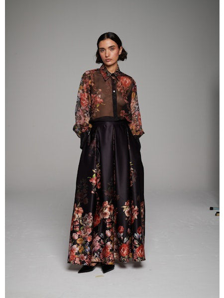 A dark, lustrous base is brought to life with an all-over painterly floral print, striking in its depth and vibrancy. Designed with a flattering high waist, this skirt elongates the figure while allowing versatile styling—from pairing with a sheer blouse for evening allure to a tailored knit for sophisticated daywear.