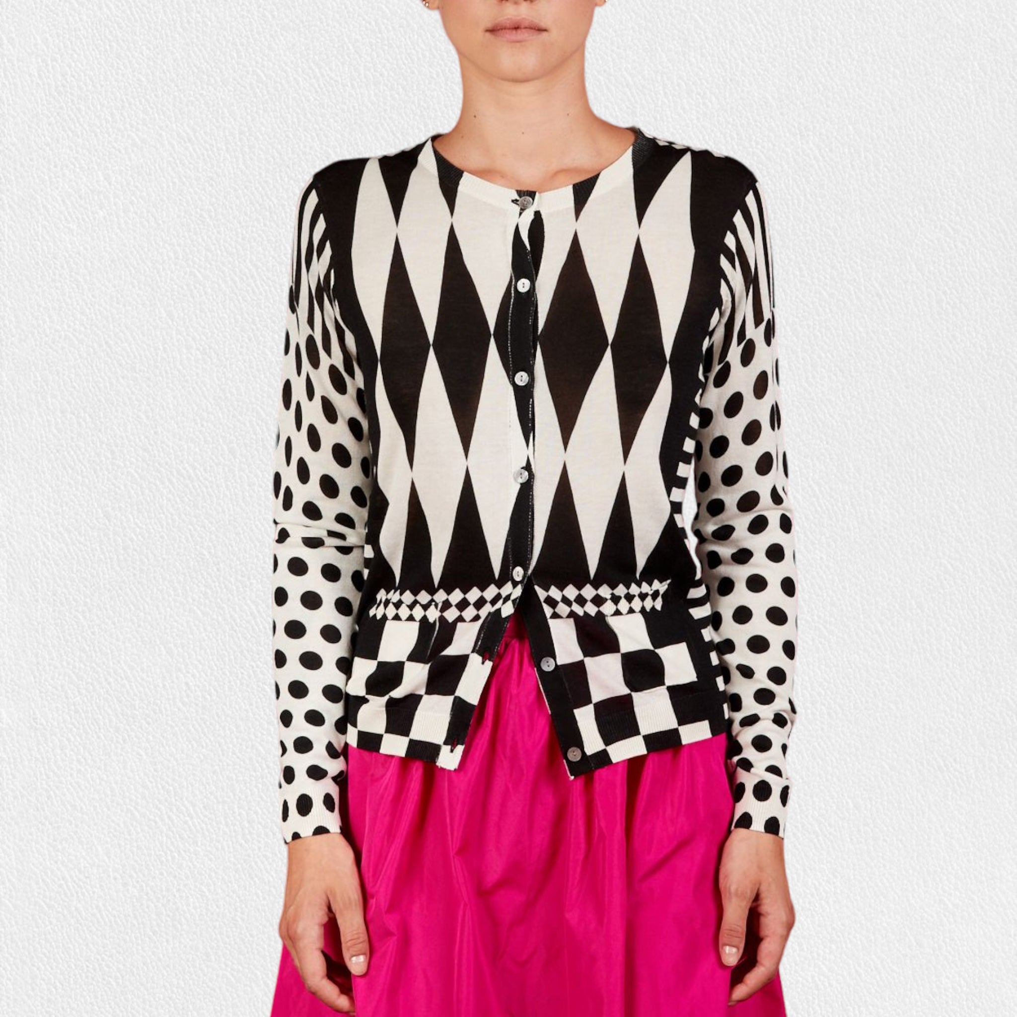 We love this new italian brand with vibrant prints. This geometric print cardigan has pockets.