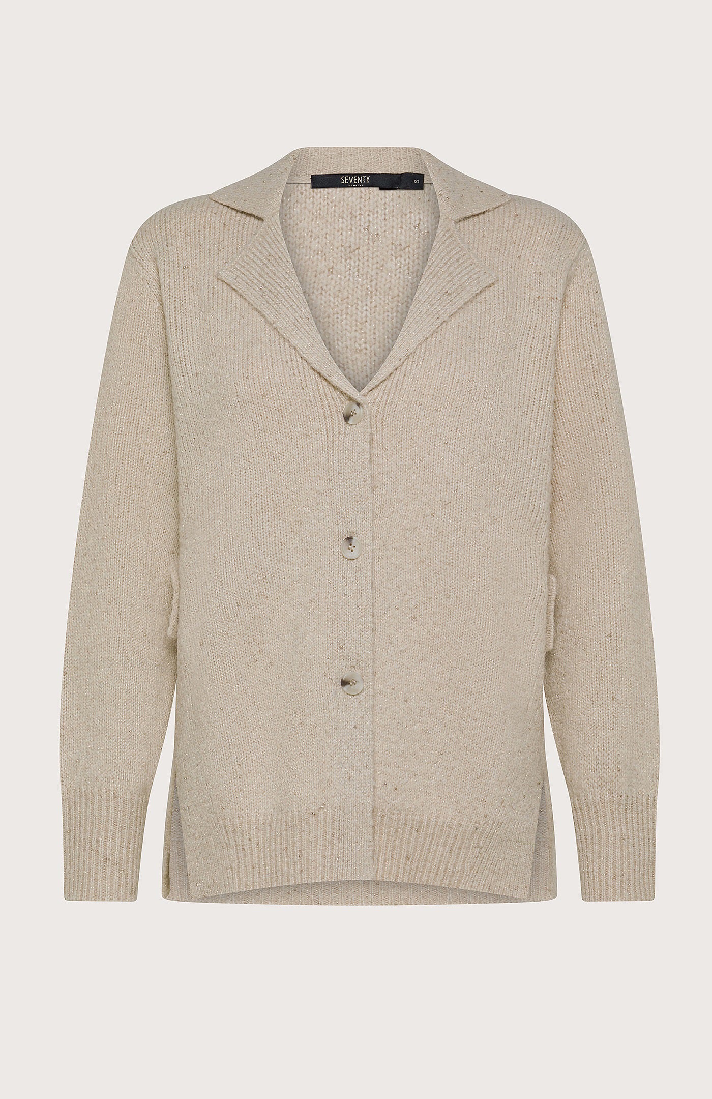 This Seventy Venezia cardigan is a refined layering piece crafted in Italy from a soft and durable blend of 59% polyester, 26% viscose, 14% wool, and 1% elastane. Designed with a relaxed yet polished silhouette, it features a notched lapel collar, a three-button front closure, and ribbed trims at the hem and cuffs for subtle structure. A wide knit belt detail at the back adds dimension and a touch of tailoring, while side slits provide ease of movement. The texture of the knit offers warmth without heaviness, making it versatile for both casual and smart styling.