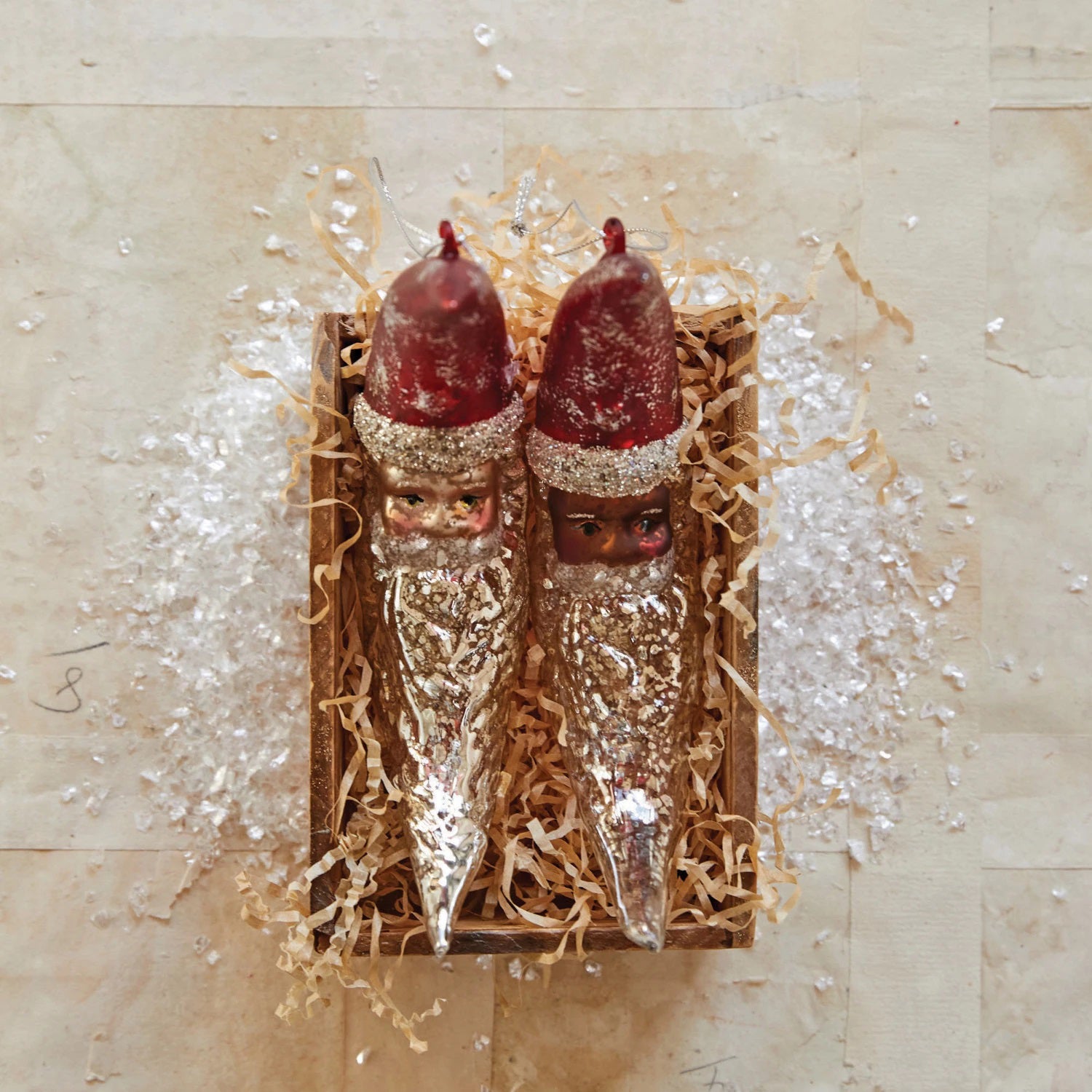 This charming mercury glass ornament features a silhouette of Santa Claus as a crescent moon with hand-painted details, finished with iridescent glitter. Ornaments can be showcased as decorations on a Christmas tree, wreath, or atop a festive centerpiece, hung from doorways, displayed on mantels, used to embellish cards and presents, or given as gifts.