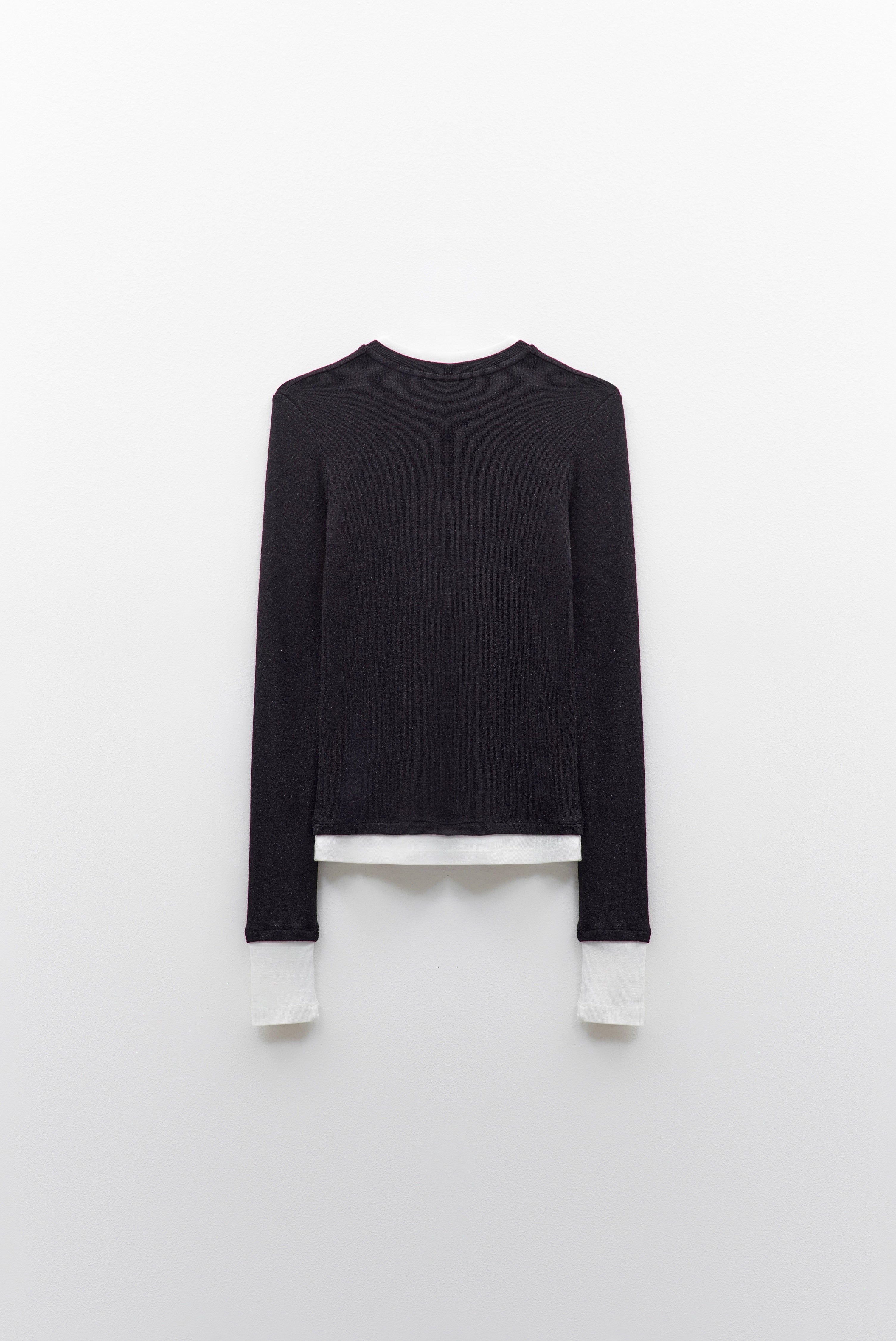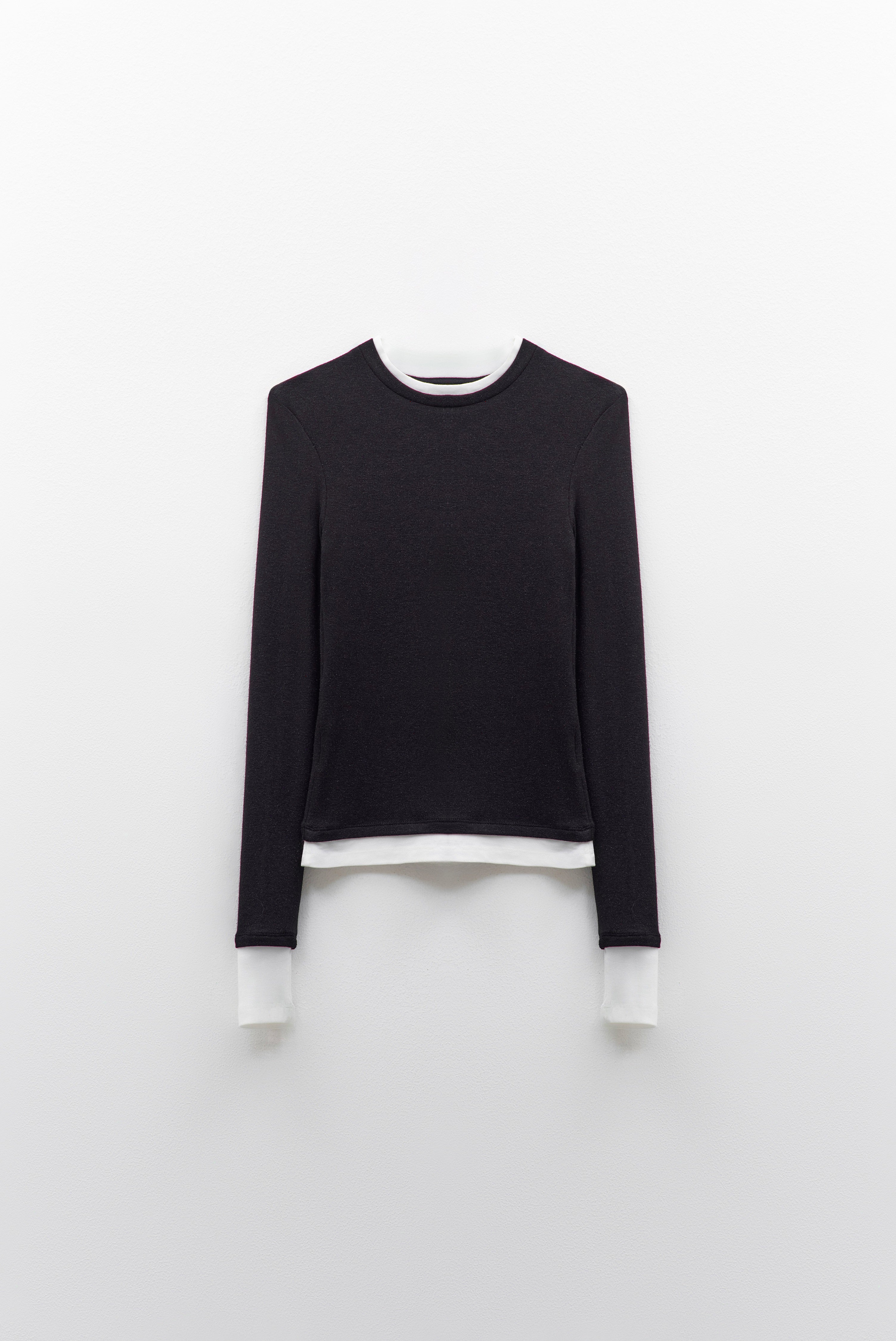 This ELEH top, crafted in Italy from a refined blend of 65% cotton, 27% polyester, and 8% elastane, embodies modern ease with an elevated edge. Designed in a sleek black with layered white trims, it creates the illusion of a perfectly styled two-piece while offering the comfort and simplicity of a single garment.