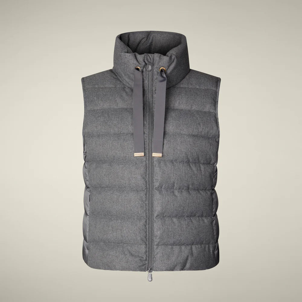 The Nyla model is a hybrid women’s puffer vest that plays with texture and materials. The front is made from soft flannel-like fabric made of recycled polyester, while the back contrasts in shiny recycled nylon. Details include zipped pockets, a high collar with grosgrain drawstring, and a glossy two-way zip with custom pullers.