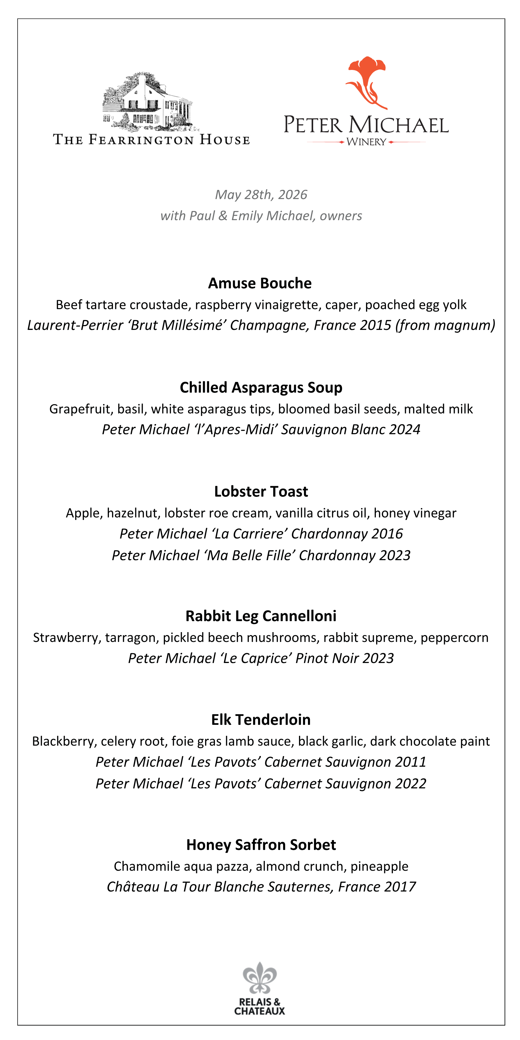 Fearrington is overjoyed to welcome Paul and Emily Michael, 2nd generation owners of Peter Michael Winery from Sonoma, California on Thursday, May 28th at 6:30pm for a very special wine dinner. Stay tuned for Chef Paul Gagne’s memorable 5-course dinner menu that will pair with 7 stellar wines. Join us!